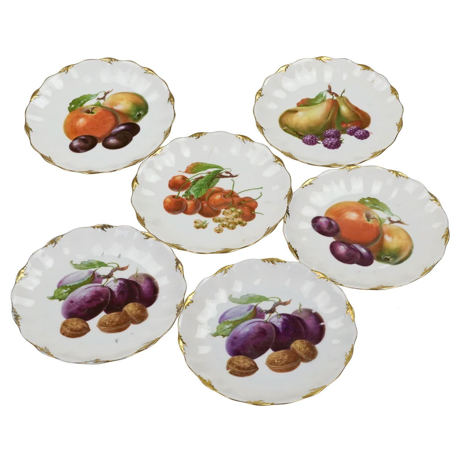 Piękny komplet sześciu talerzy z bukietem owoców.