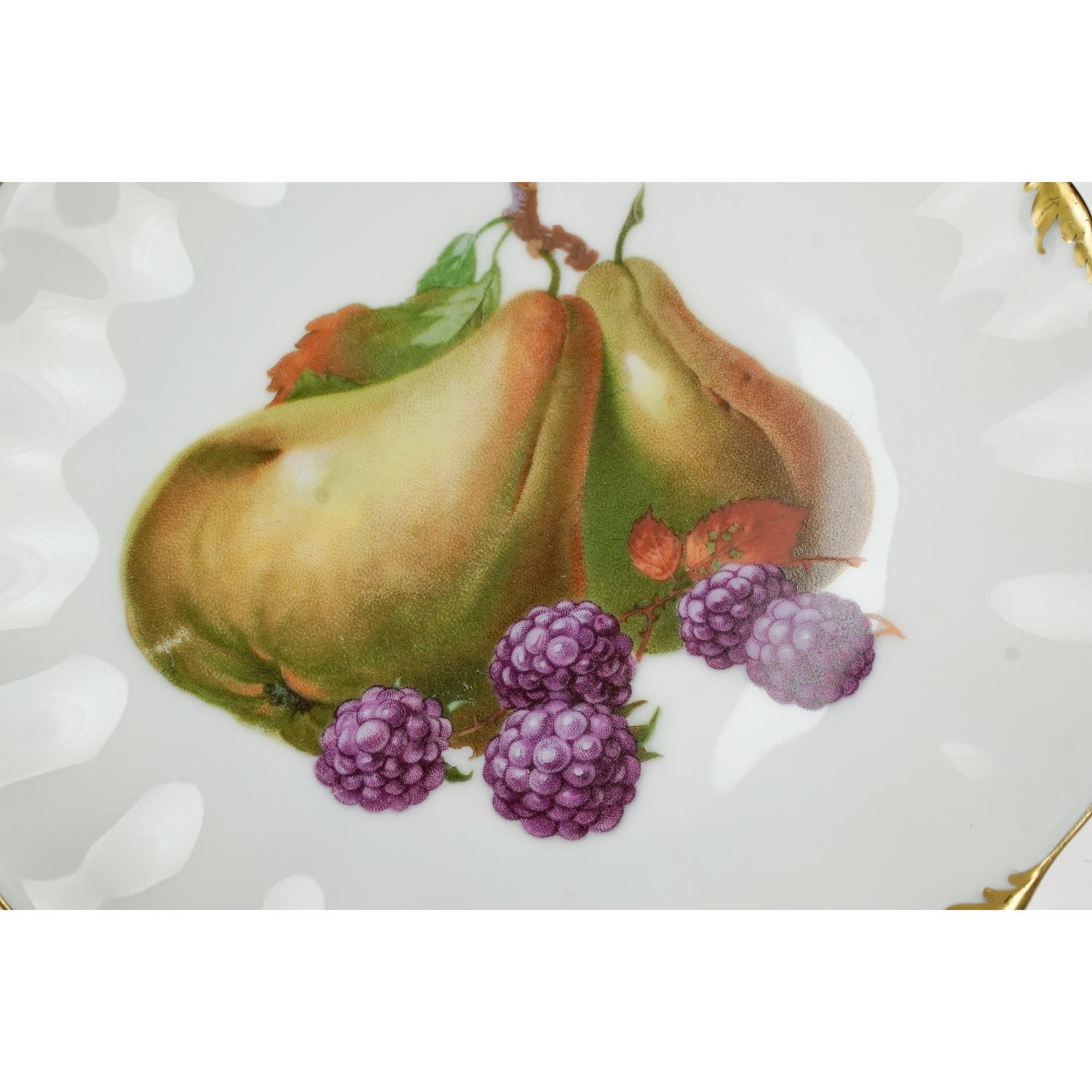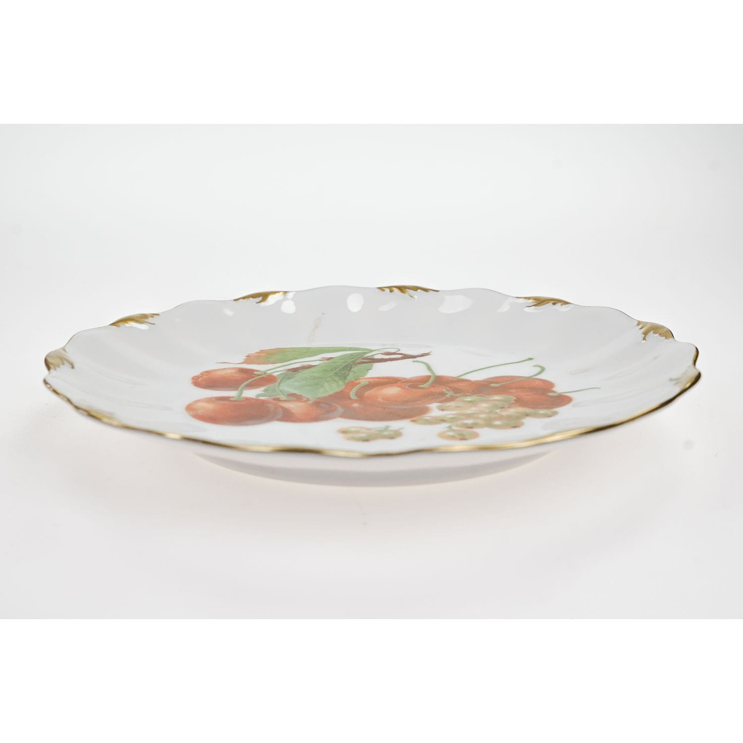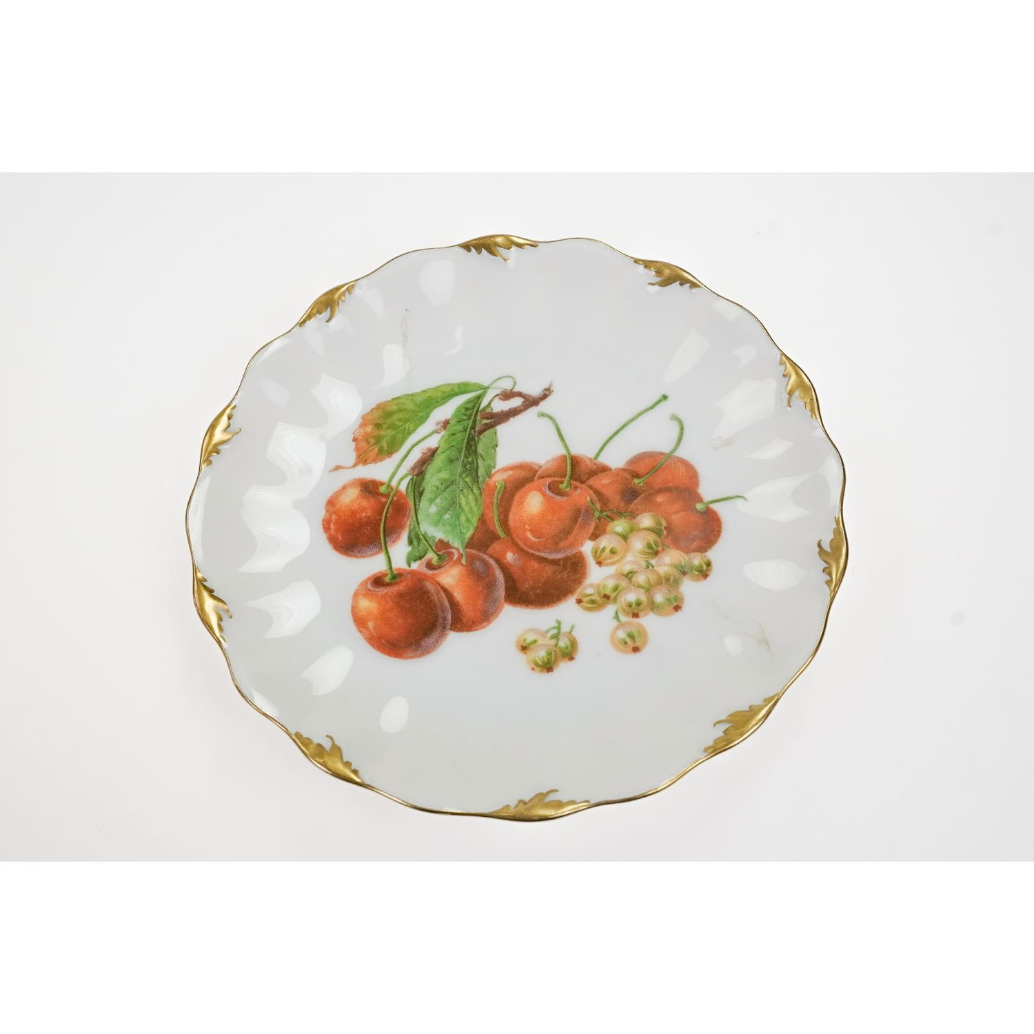 Pochodzi z Blankenhain, VEB Weimar Porzellan (C. & E. Carstens ), sygnowany znakiem stosowanym od 1933 roku. Fason Marga. Porcelana w odcieniu bieli, szkliwiona z uroczymi reliefami. Krawędzie ręcznie podkreślone złoceniami Na lustrze uroczy, barwny, realistyczny bukiet smakowitych owoców.
