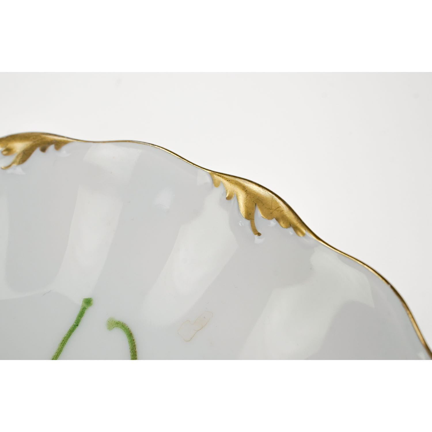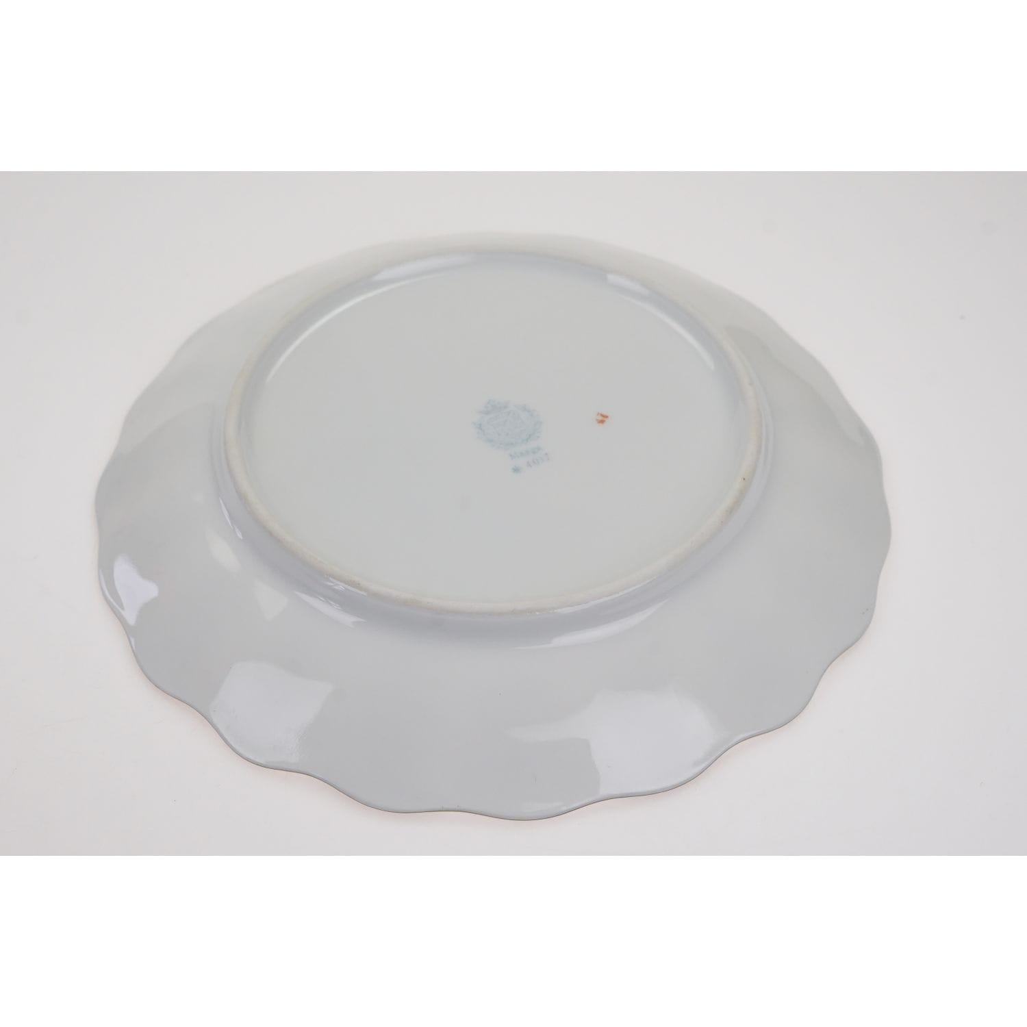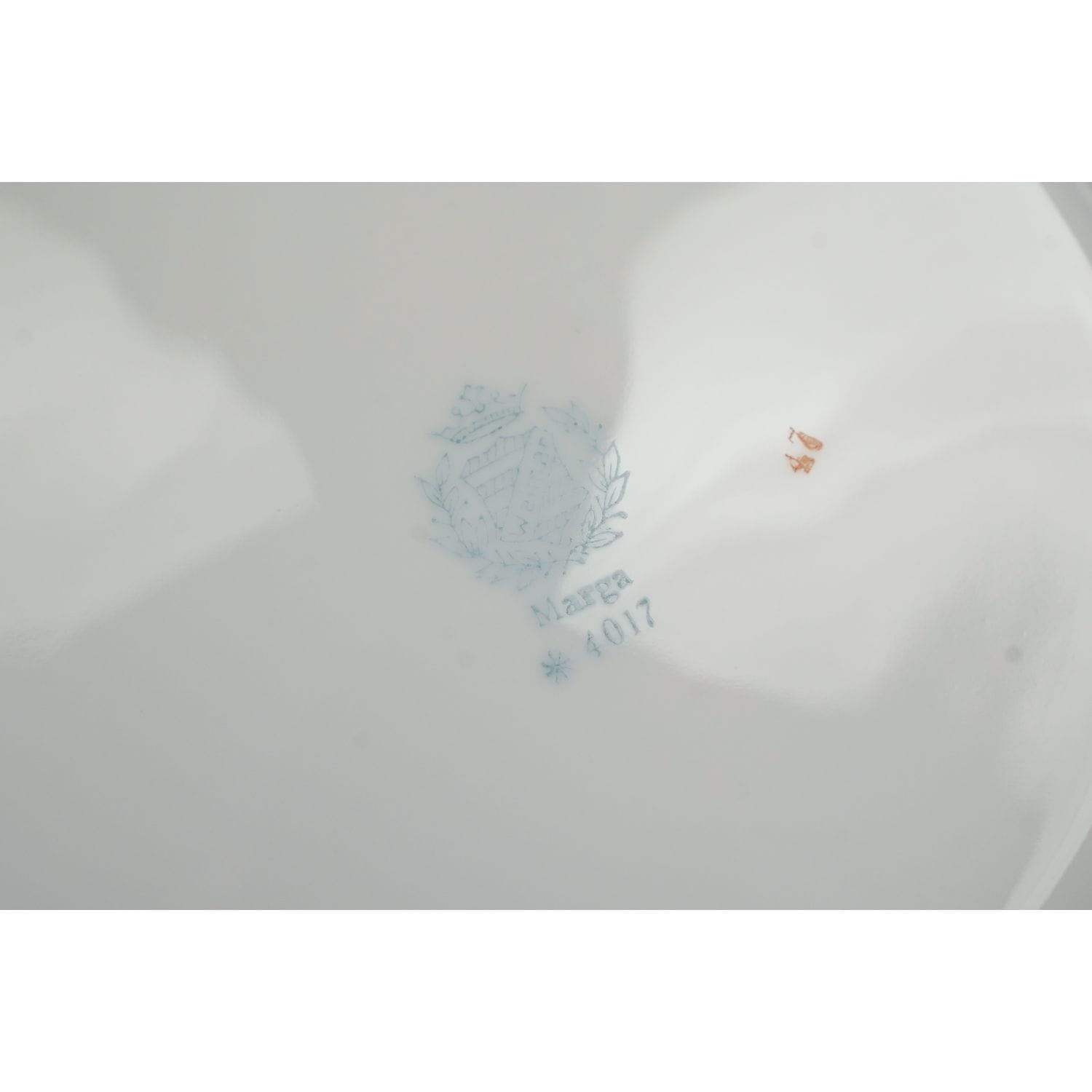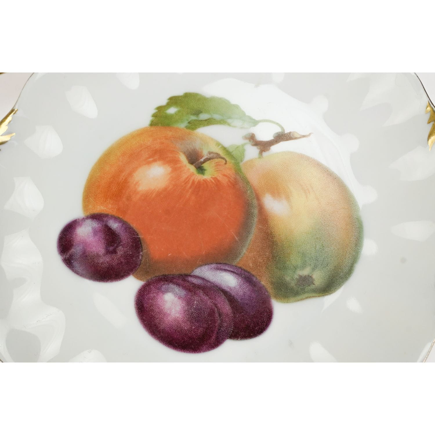 Pochodzi z Blankenhain, VEB Weimar Porzellan (C. & E. Carstens ), sygnowany znakiem stosowanym od 1933 roku. Fason Marga. Porcelana w odcieniu bieli, szkliwiona z uroczymi reliefami. Krawędzie ręcznie podkreślone złoceniami Na lustrze uroczy, barwny, realistyczny bukiet smakowitych owoców.