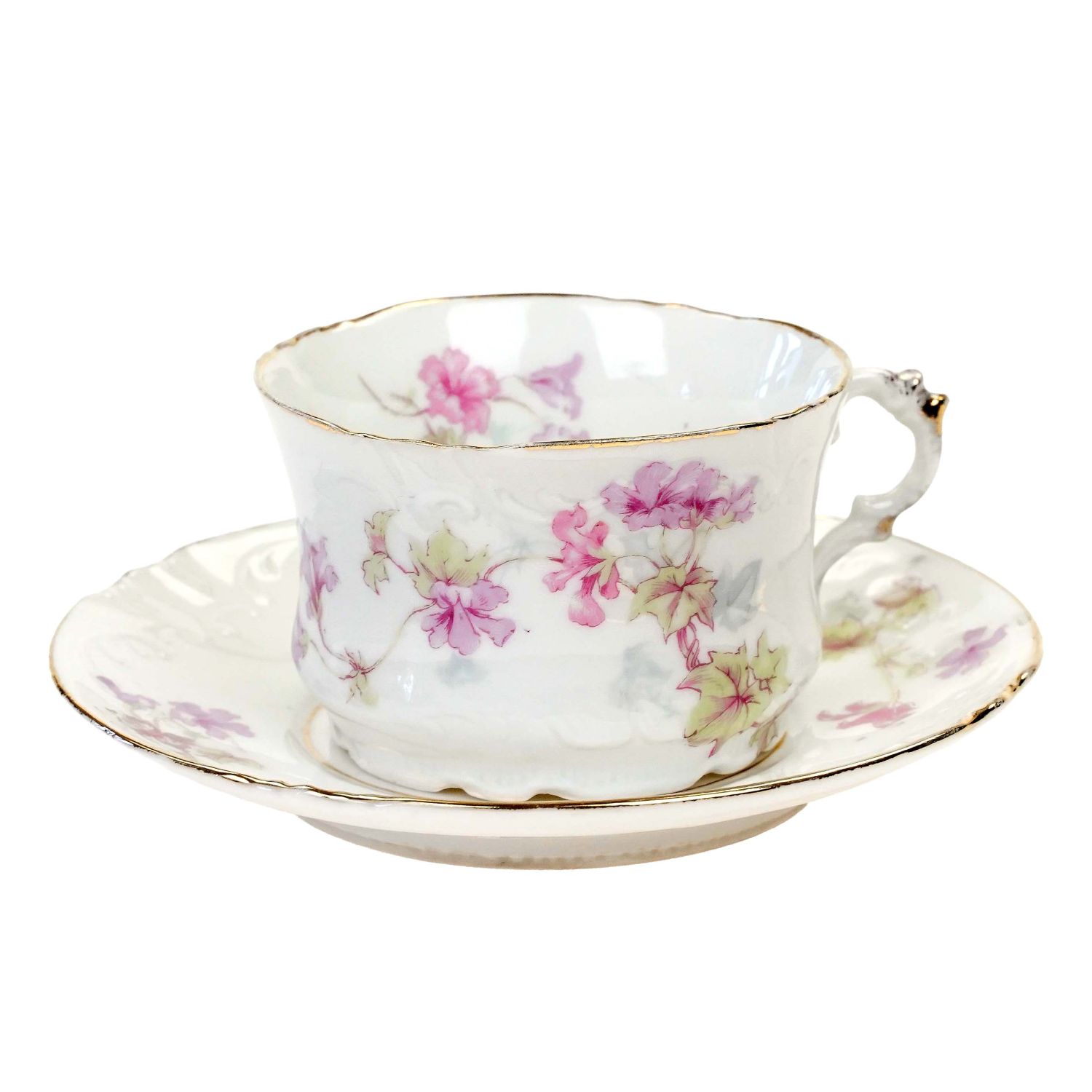 Sygnowana przez manufakturę Gebrüder Fasolt z Blankenkaim, znakiem stosowanym już od 1848 aż do 1933 roku. Wykonana z białej, reliefowanej porcelany. Filiżanka ma śliczną, ponadczasową formę. Ładnie uformowane uszko. Na porcelanie fioletowe kwiaty fiołeczków. Kontury w złoceniach.