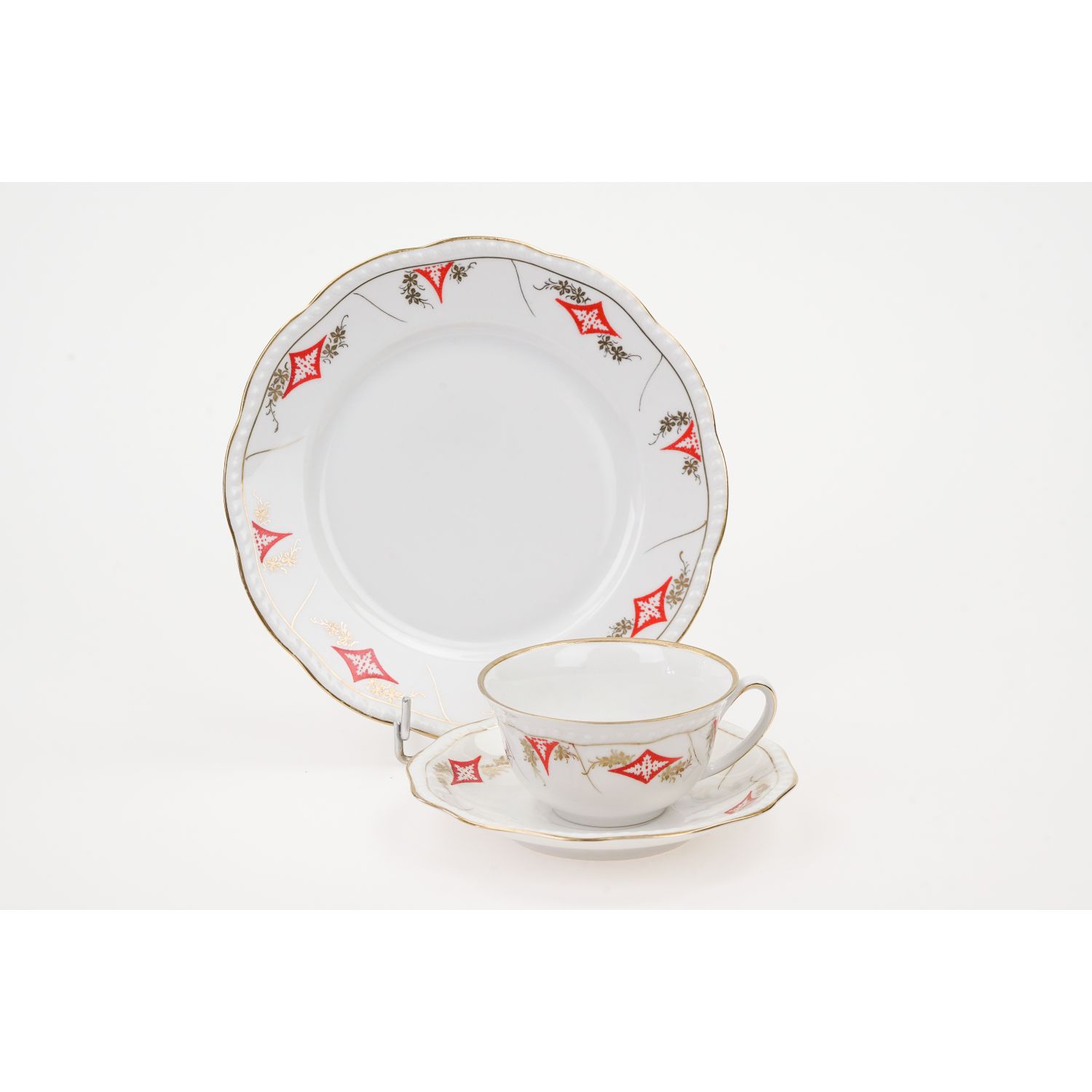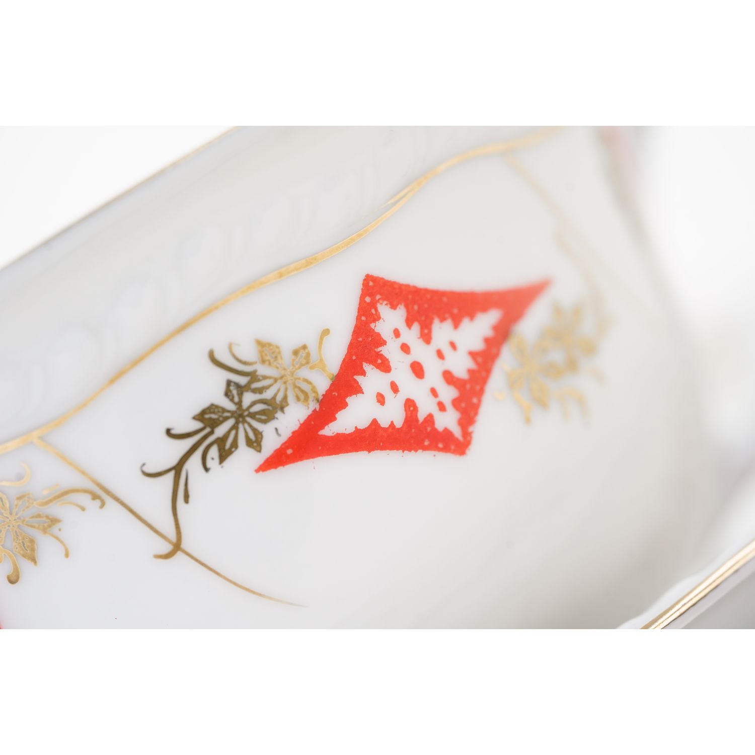 Sygnowany przez manufakturę Gebrüder Fasolt z Blankenkaim, znakiem stosowanym już od 1848 aż do 1933 roku. Wykonany z białej, cieniusieńkiej porcelany (zwłaszcza prześwitująca filiżanka). Filiżanka ma fantastyczną formę. Krawędzie ozdobione sznureczkowym reliefem. Porcelana udekorowana złotymi i czerwonymi ornamentami. Ranty złocone.