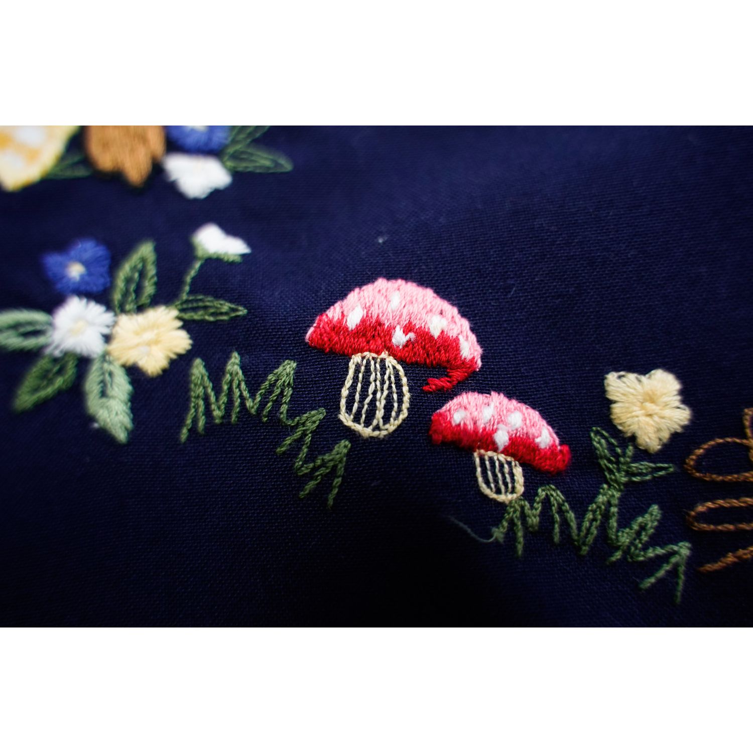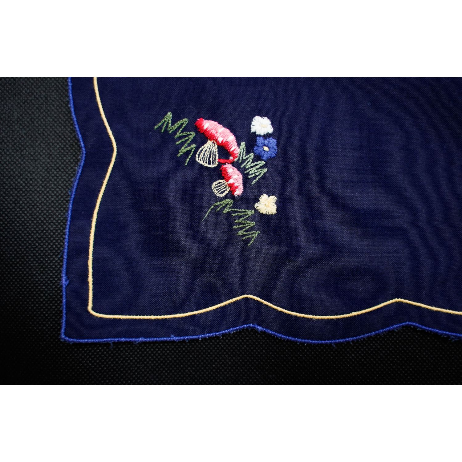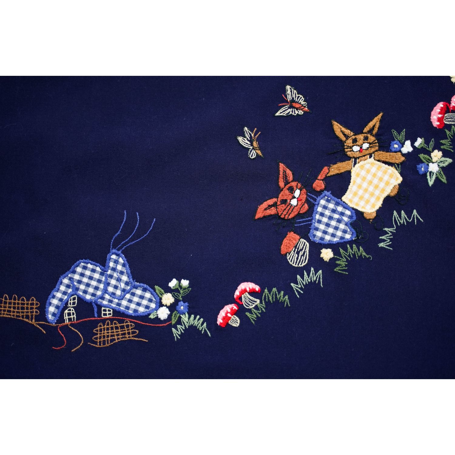 Wykonana z dość grubej tkaniny w granatowym kolorze z jakimś sztucznym dodatkiem. Na tkaninie haft maszynowy i aplikacje z innych materiałów przedstawiające zajączki, kwiatki i pisanki. Brzeg falowany, obszyty żółtą niteczką brzeg.