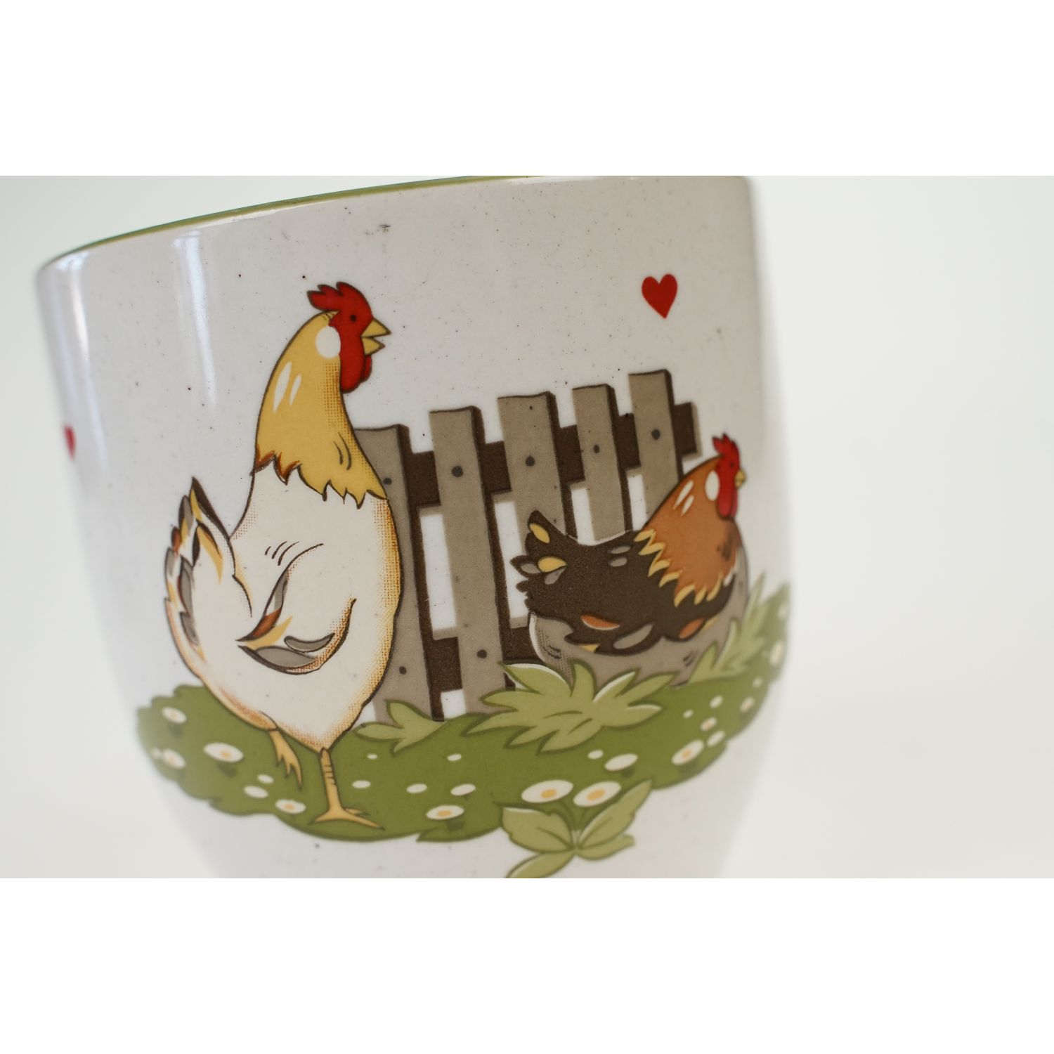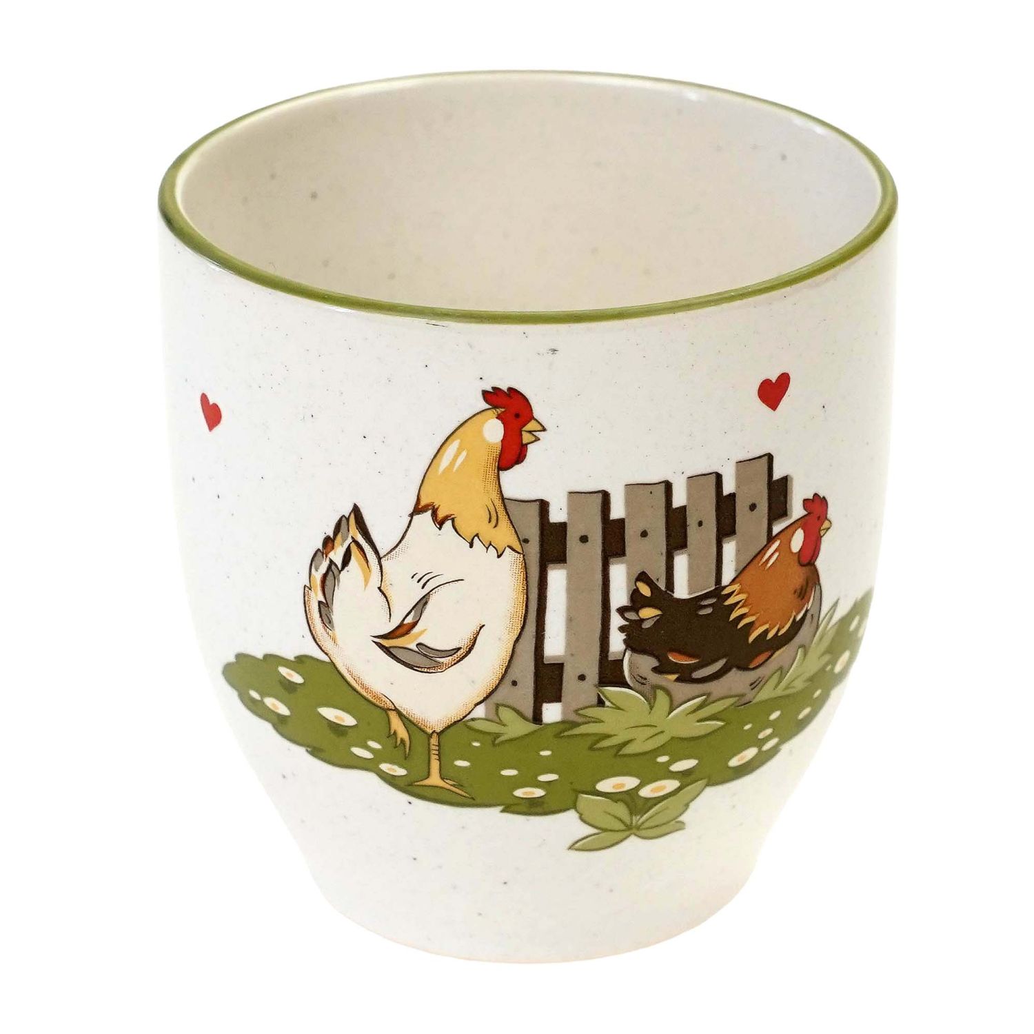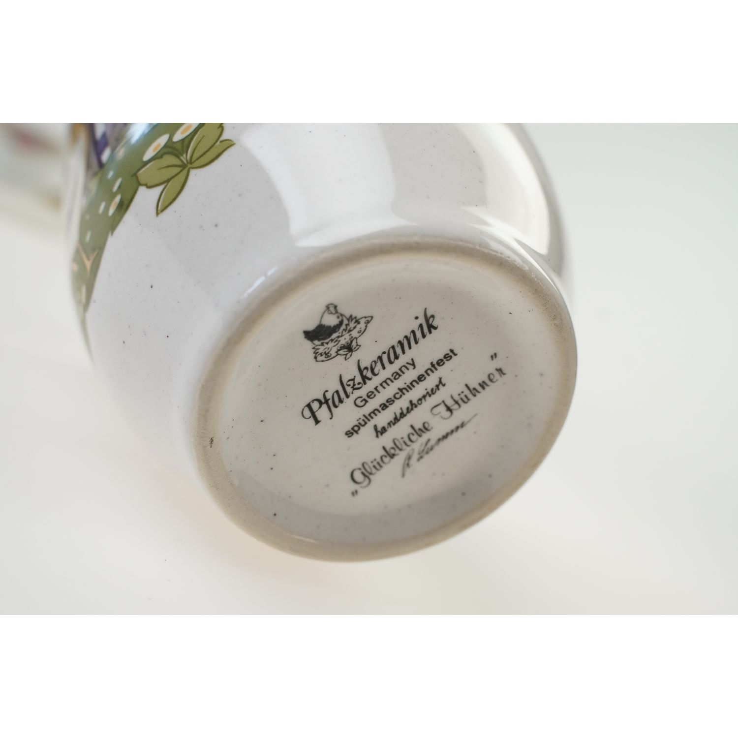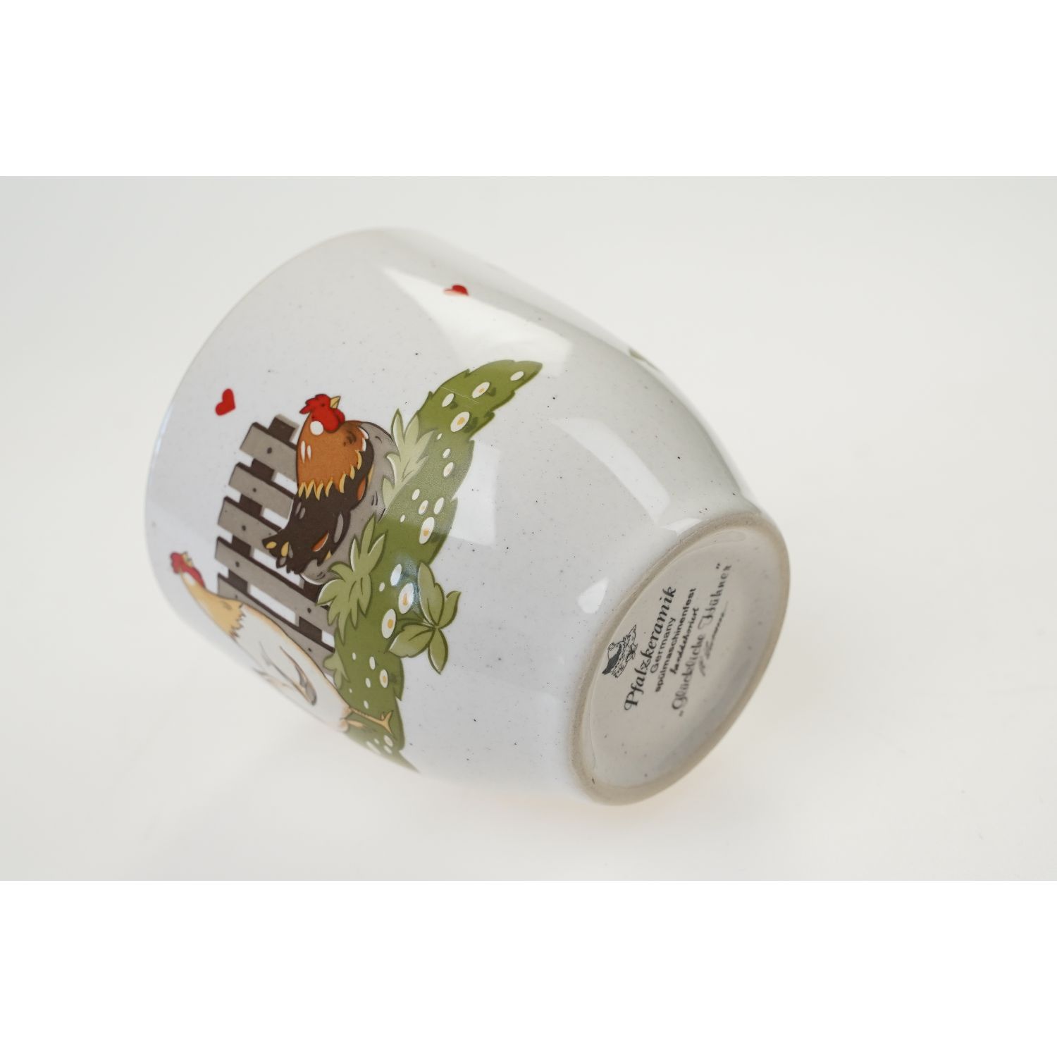 Pochodzi z Niemiec z Pfalzkeramik. Dekoracja Glückliche Hühner. Ceramika szkliwiona w kremowym odcieniu nakrapiana. Na kubku szczęśliwa rodzina kurek; kogucik i kurka i serduszka. Kontury w zielonej obwódce.