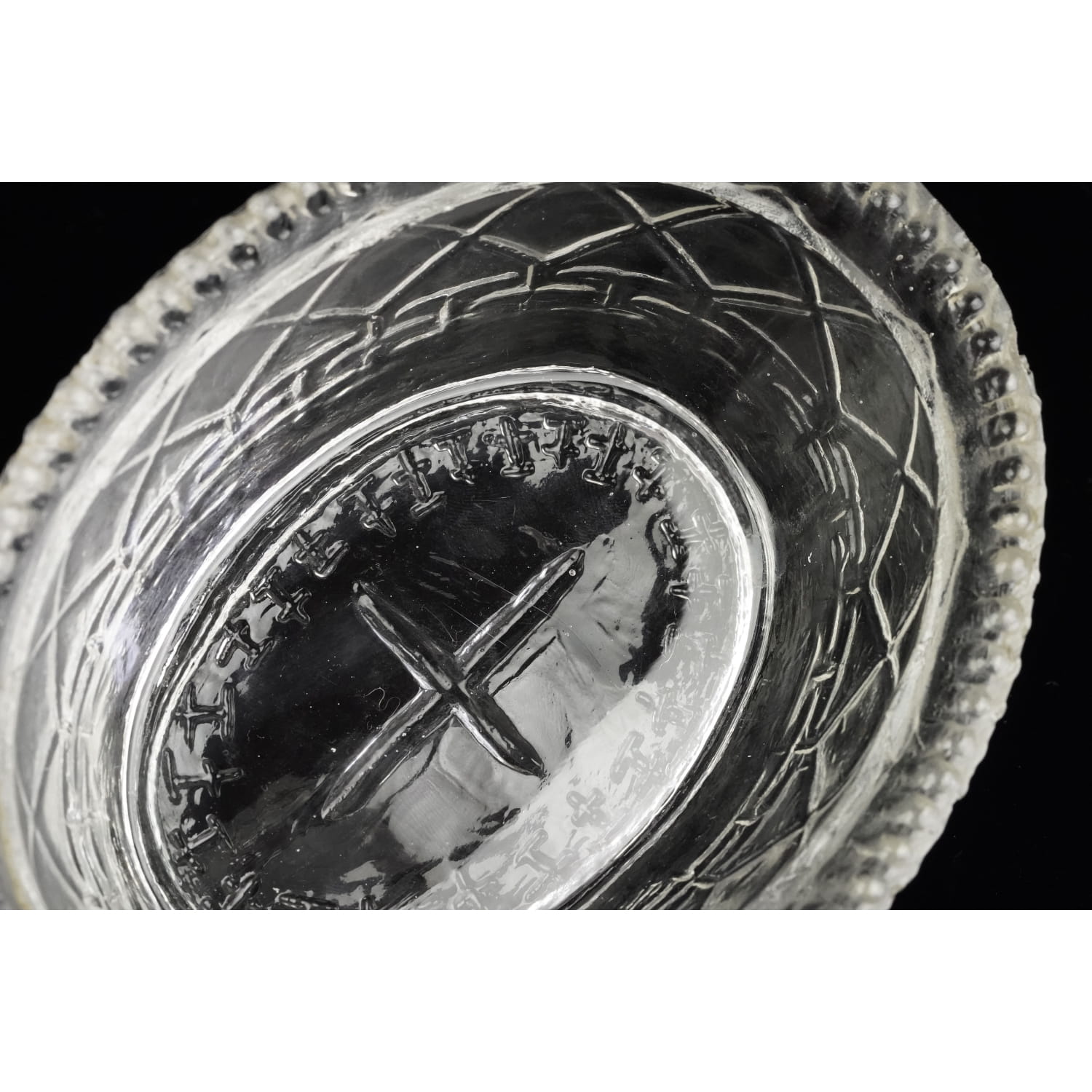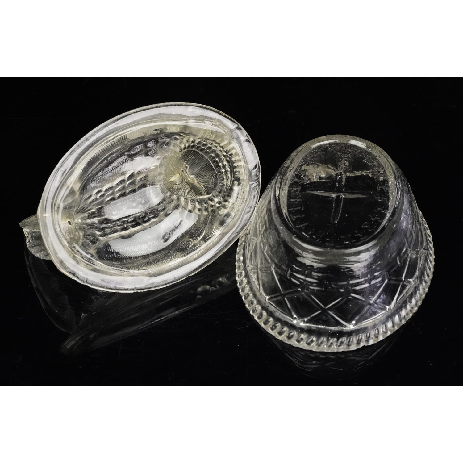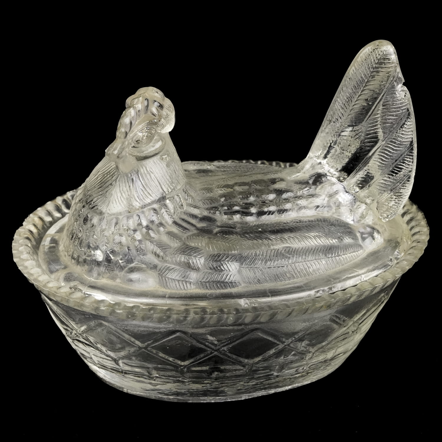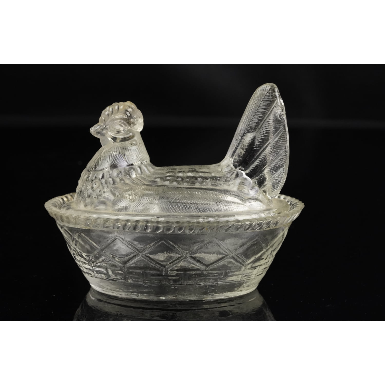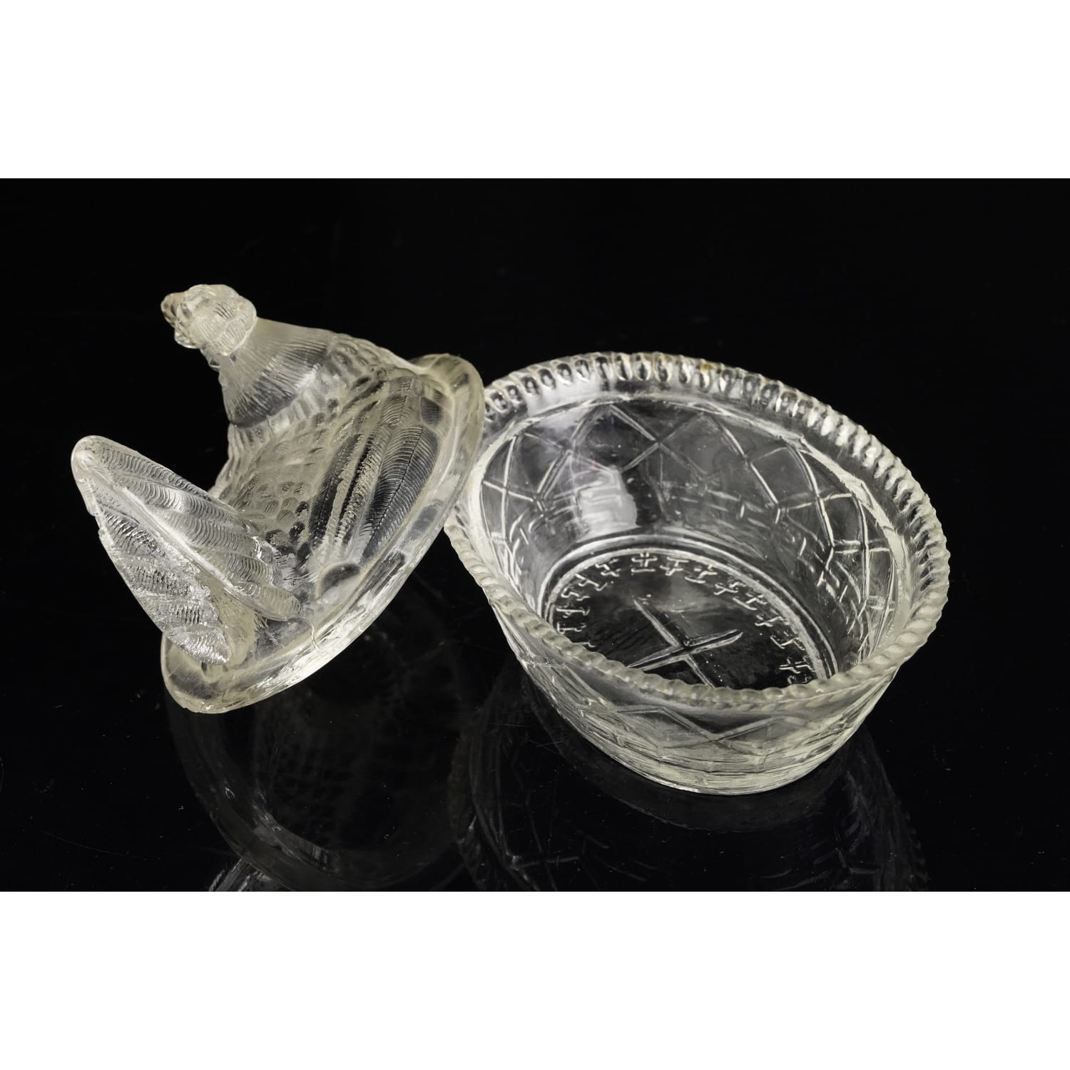 Pochodzi ze Stanów Zjednoczonych. Pochodzi najprawdopodobniej z Westmoreland z lat 50-tych XX wieku. Szkło prasowane w bezbarwne. Pokrywa, górna część ma kształt kury, dolna gniazdka we wzór w kostkę ze sznureczkowym reliefem na rancie.