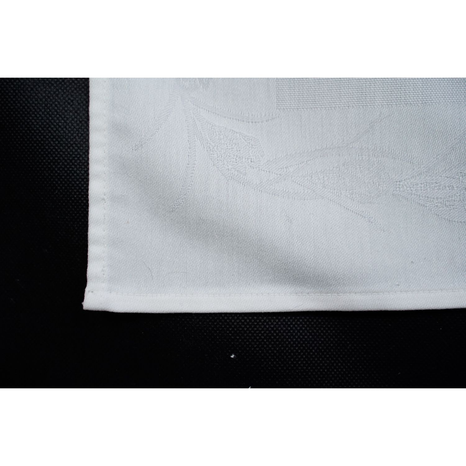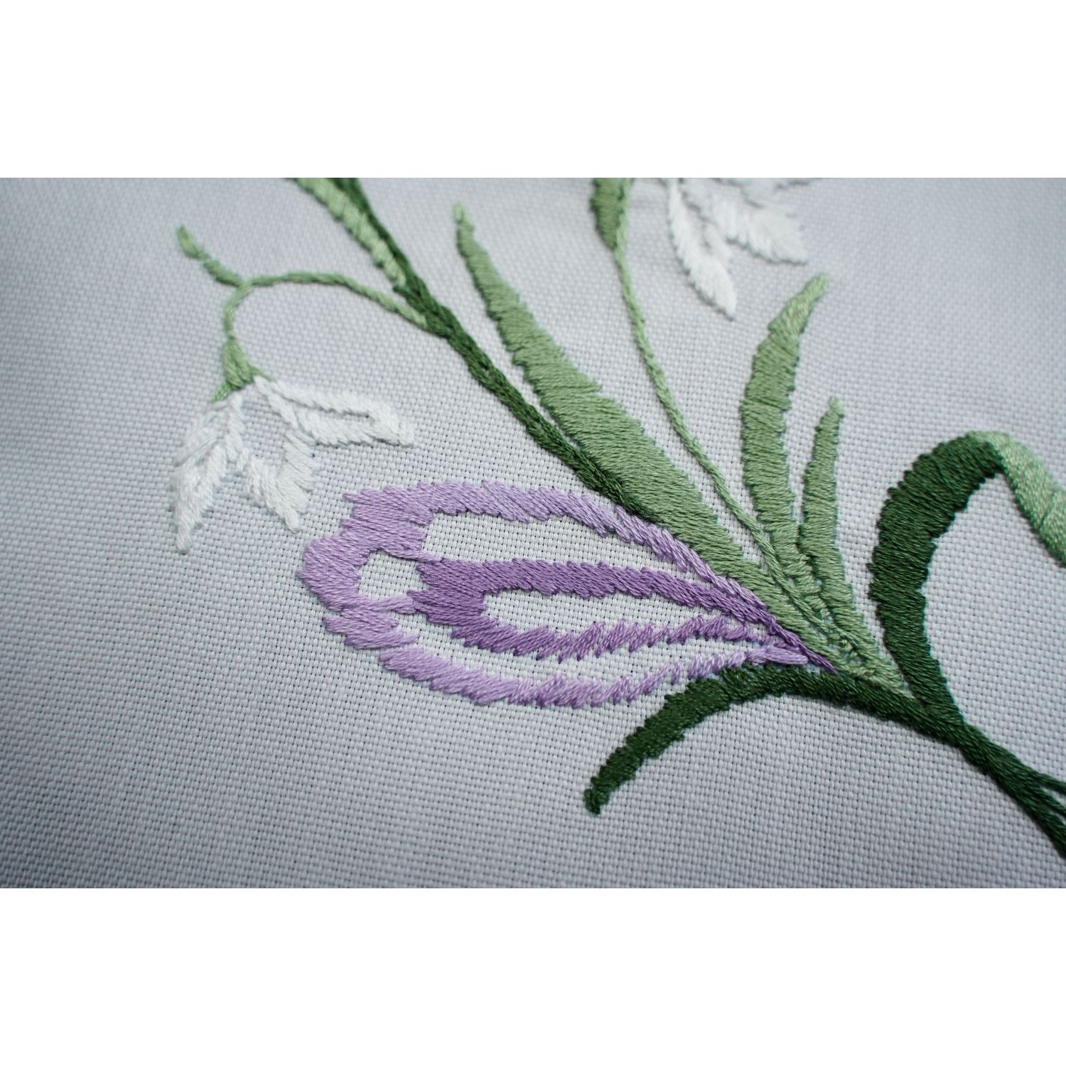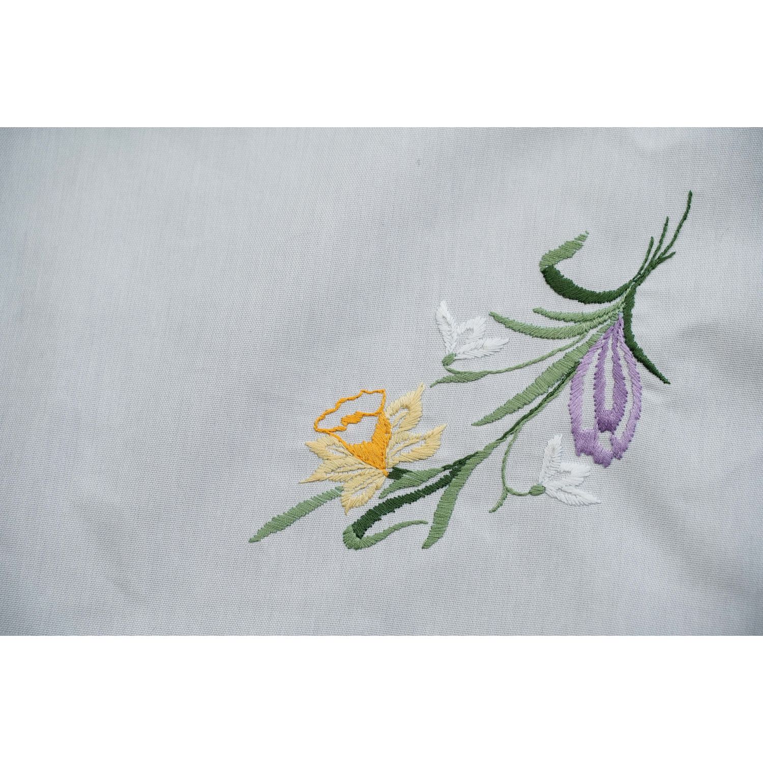 Tkanina w odcieniu jasnego kremu lub złamanej bieli z lekkim połyskiem. Bawełna z jakimś dodatkiem. Z tłoczonym szlaczkiem krokusów. Na obrusie ręcznie wyszywane bukiety wiosennych kwiatów: krokusy, żonkile i przebiśniegi.
