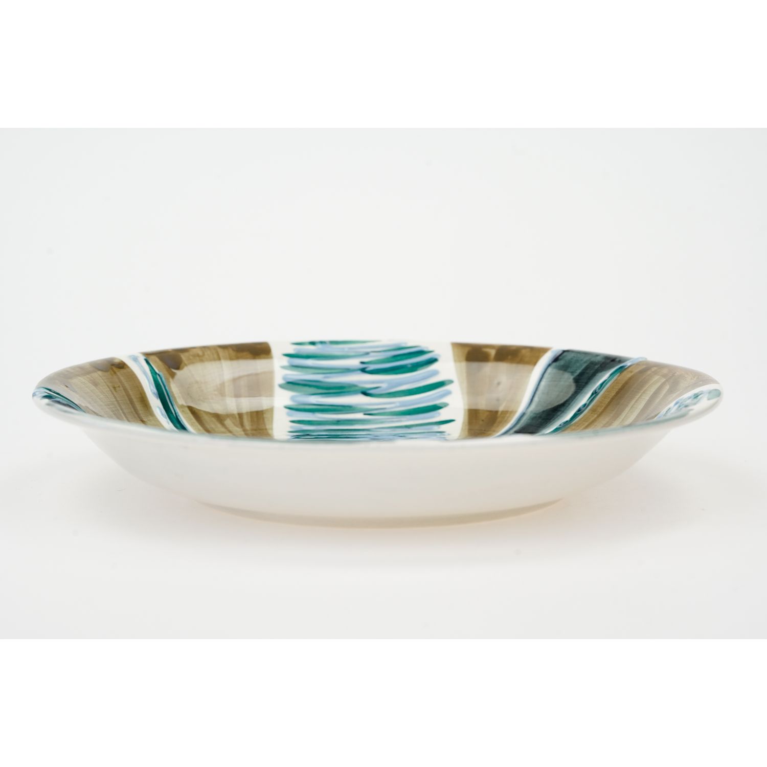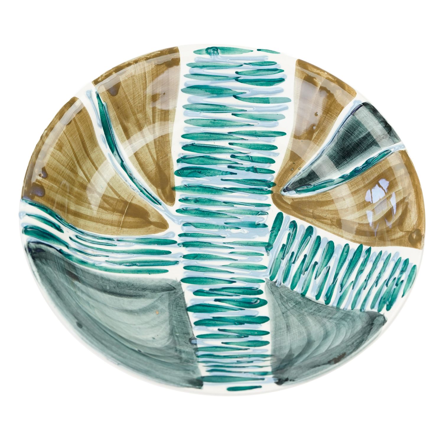 Pochodzi z Włocławka z Zakładów Fajansu im.Rewolucji 1905 r.potem Zakłady Fajansu "Włocławek". Sygnowana zielonym drukiem podszkliwnym: Made / in Poland / Zakłady Fajansu Rewolucji 1905 Włocławek / Hand / painted / 6456. Z abstrakcyjną dekoracją w odcieniach zieleni, błękitu, beżu.