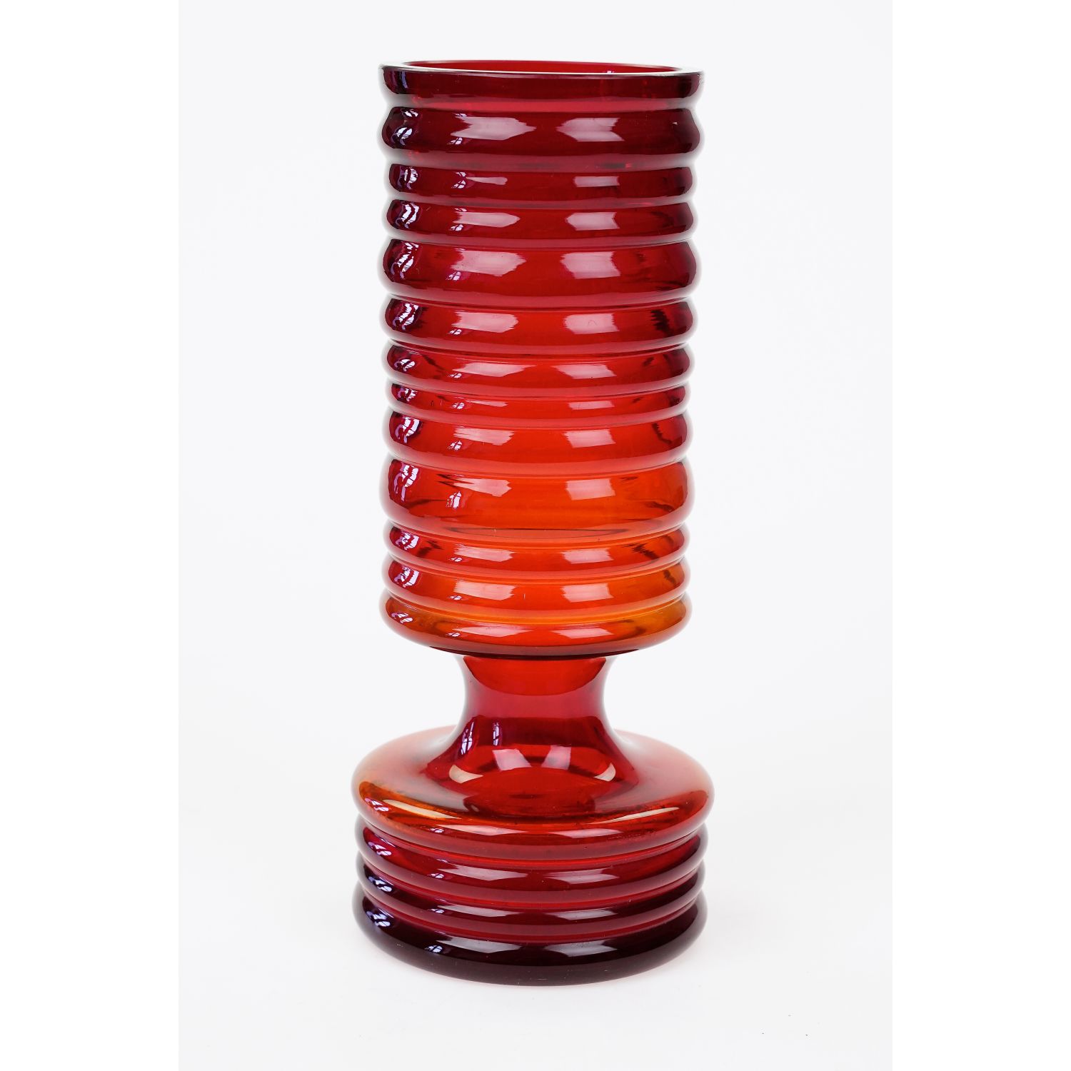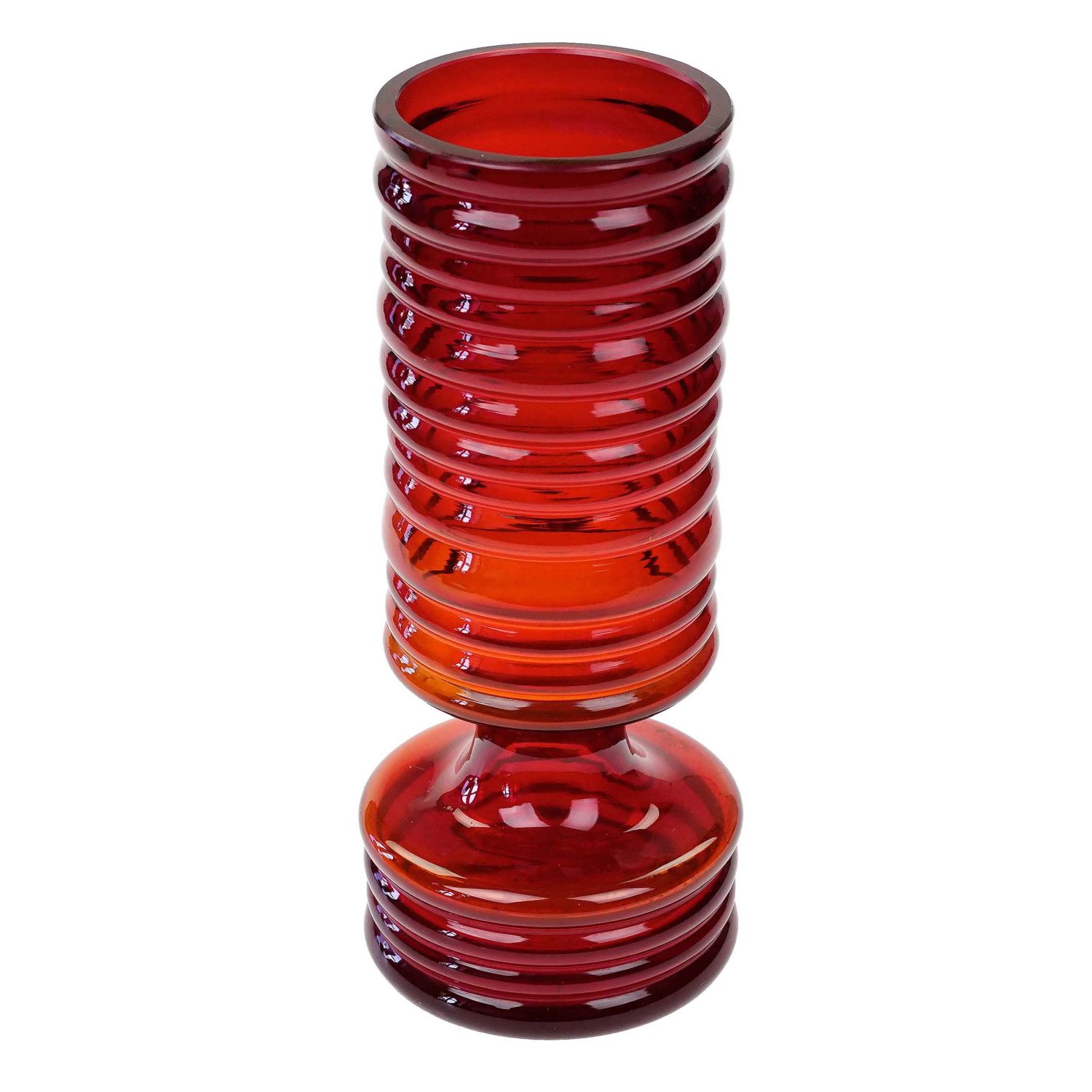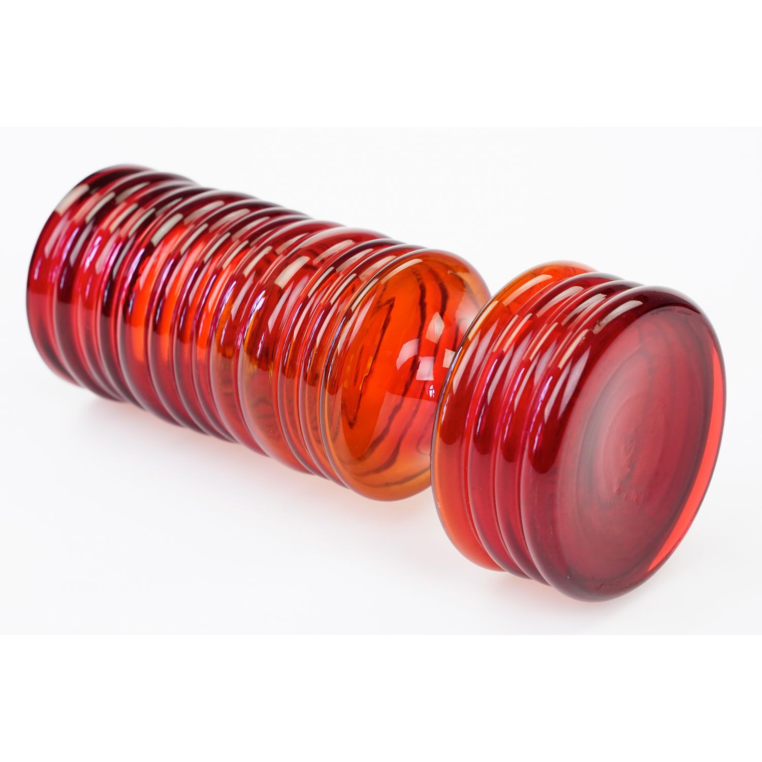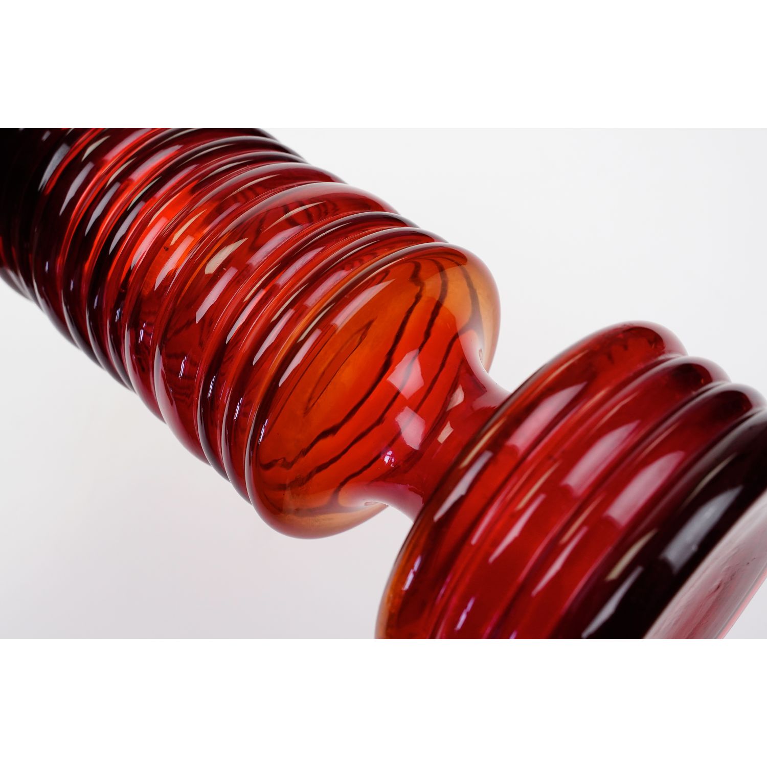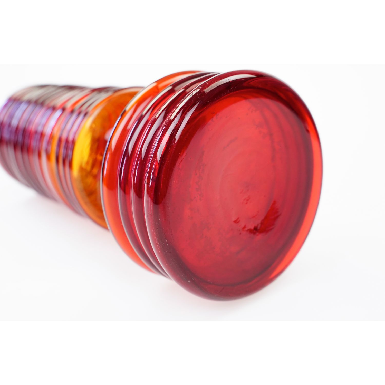 Szkło sodowe, barwione w masie na żywy, czerwony kolor. Cała powierzchnia pokryta pierścieniami. W dolnej części zaskakujące wcięcie. Górna krawędź zeszlifowana