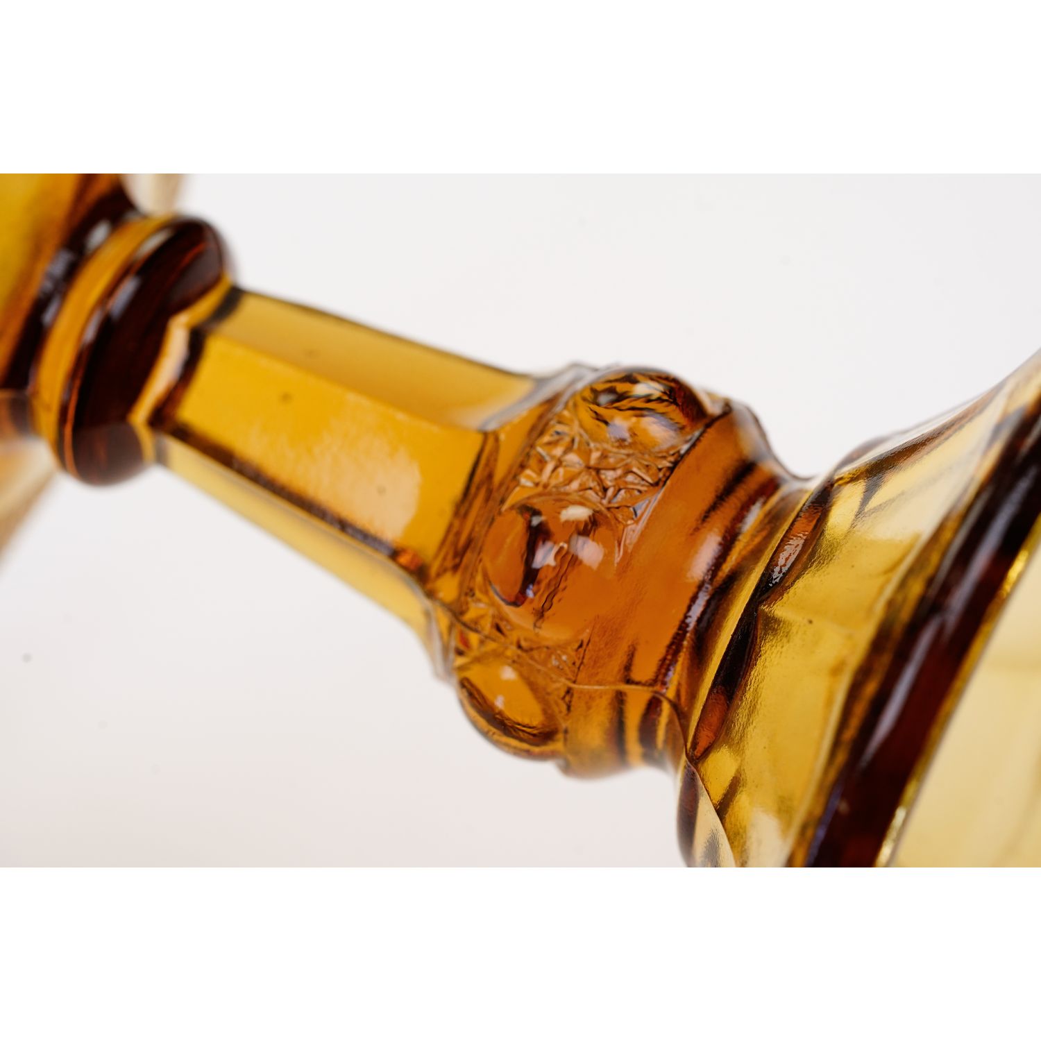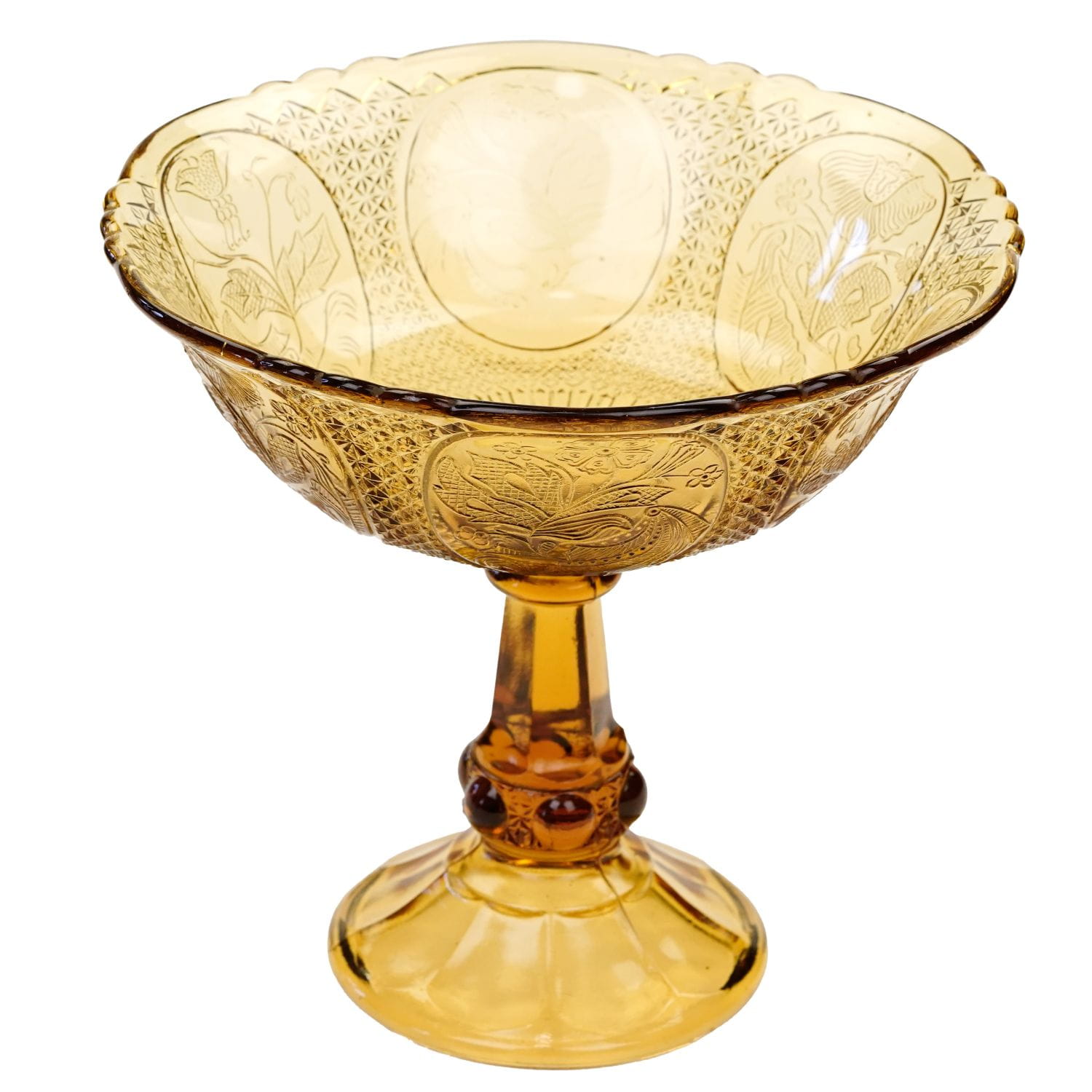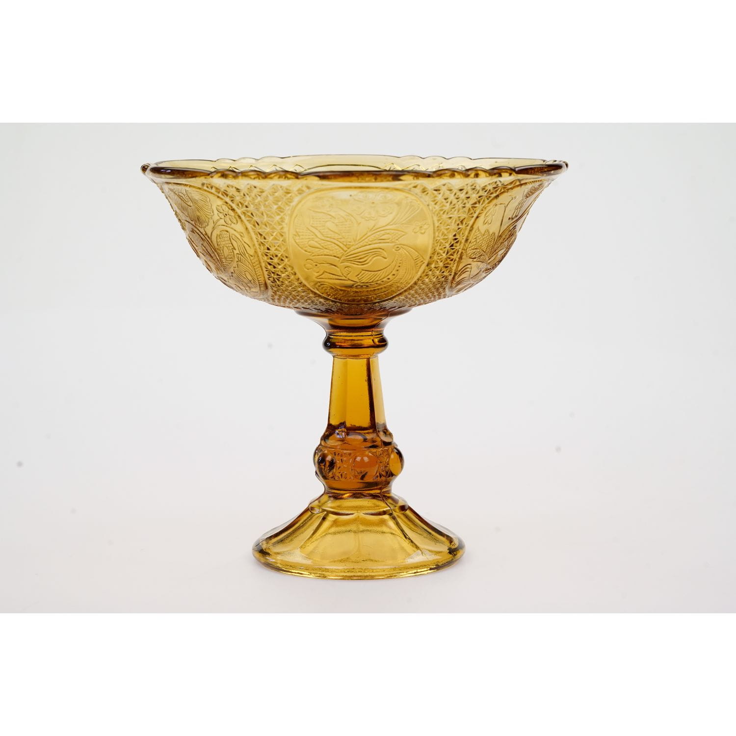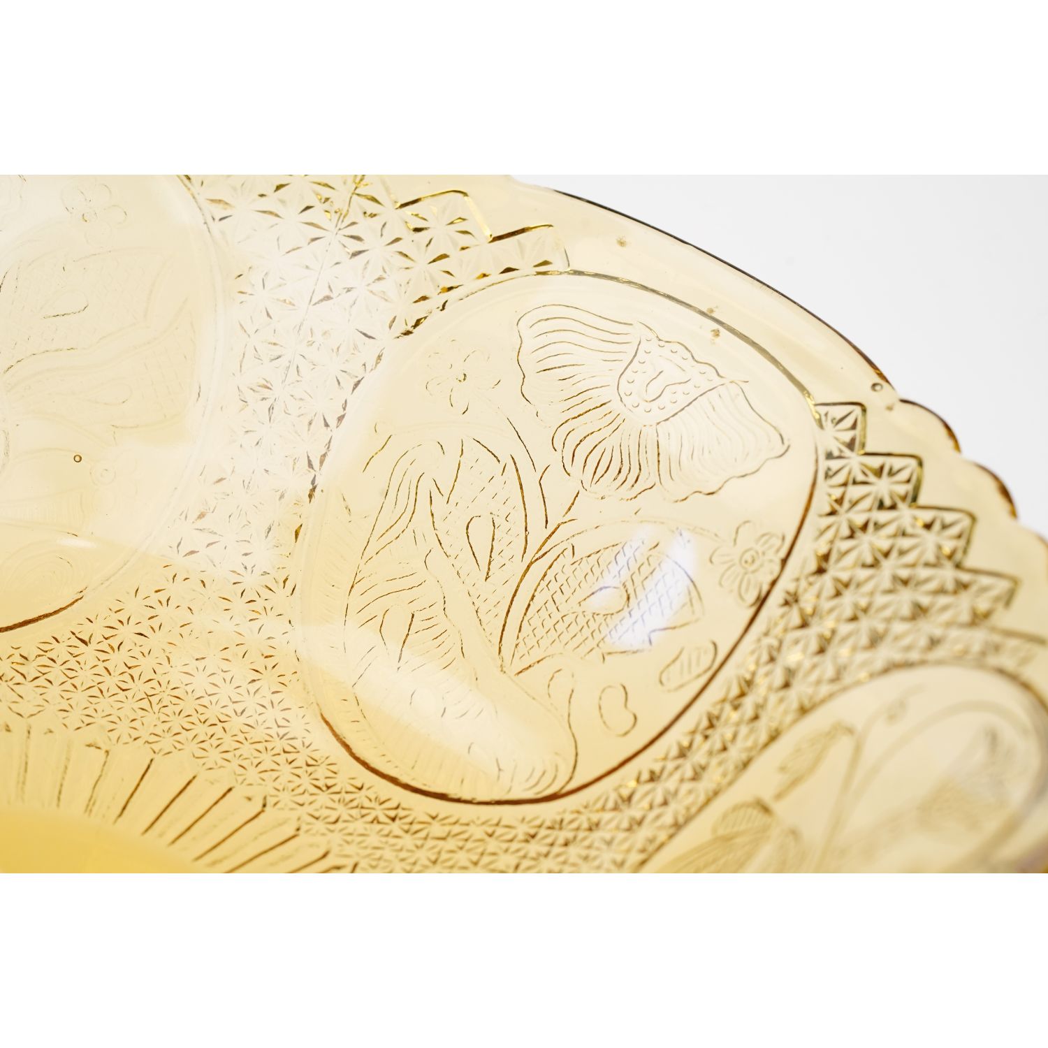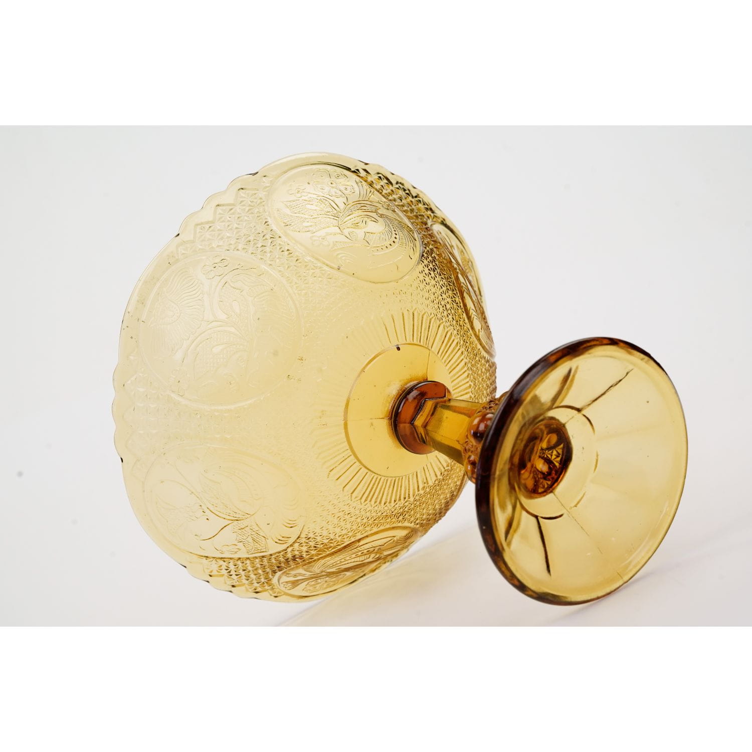 Patera powstała w hucie szkła Ząbkowice, nr katalogowy z 1910 roku, to 1180. Zachowana w stylu secesyjnym. Wykonana ze szkła prasowanego, barwionego w masie na bursztynowy kolor. Solidna, ciężka, ciemna noga. Czasza duża, skupiona, dekorowana tłoczeniami w medaliony, w każdym medalionie inny kwiatowy ornament.