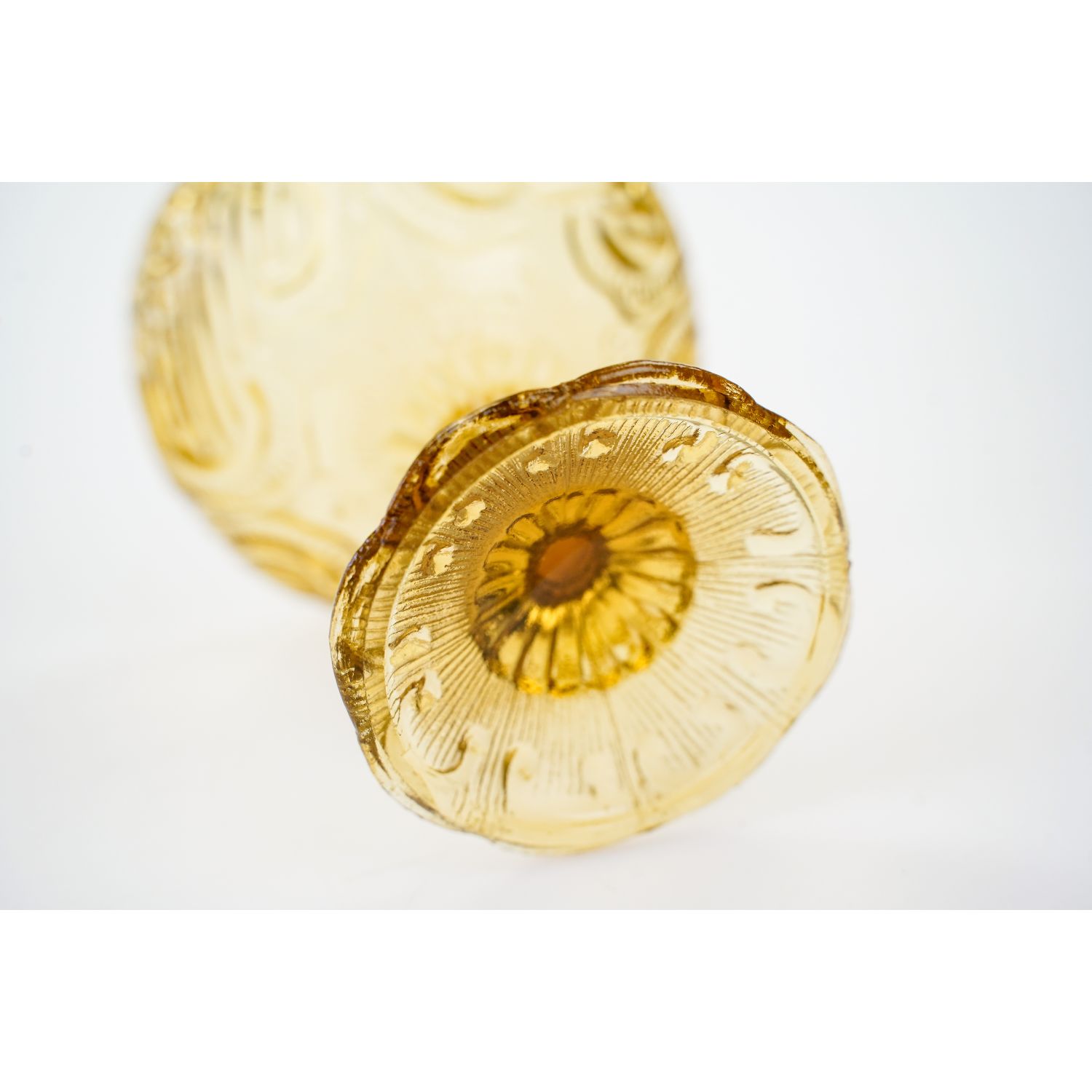 Szkło parsowane, w efektownym i ciekawym, bursztynowym kolorze wykonane w hucie szkła Ząbkowice katalogowana, w katalogu z 1910 roku nr 1037. Ślicznie zdobiony tłoczeniami w zawijasy. Piękny egzemplarz.