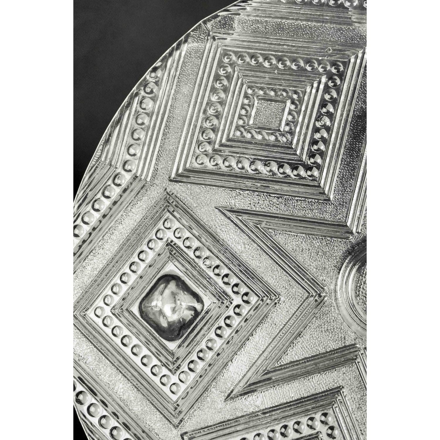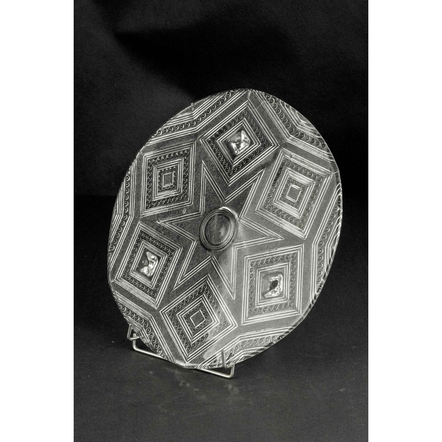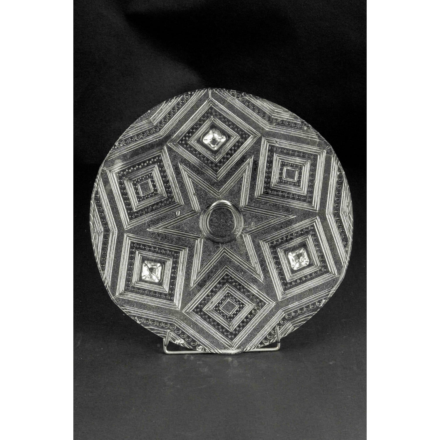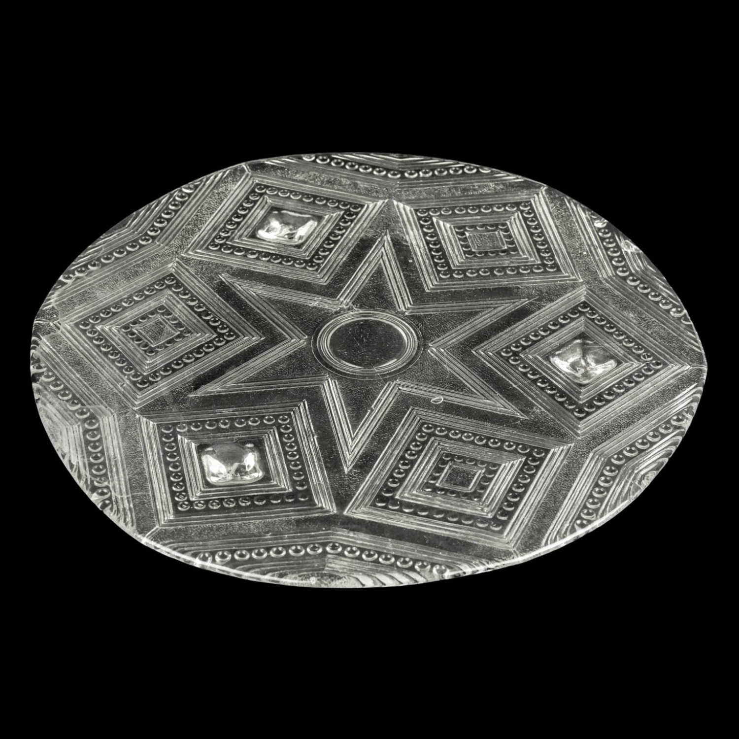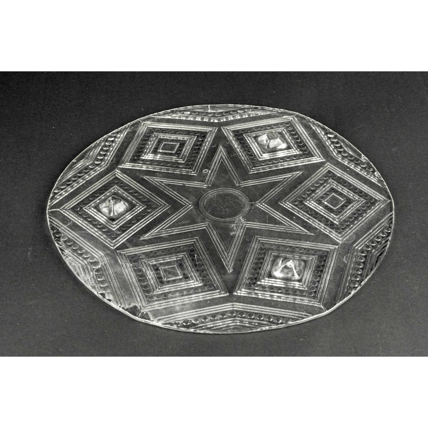 Pochodzi z huty szkła z Ząbkowic. Szkło prasowane, bezbarwne. Od spodu, na całej powierzchni kanelowania i guziki układające się w geometryczny wzór z gwiazdą na środku.
