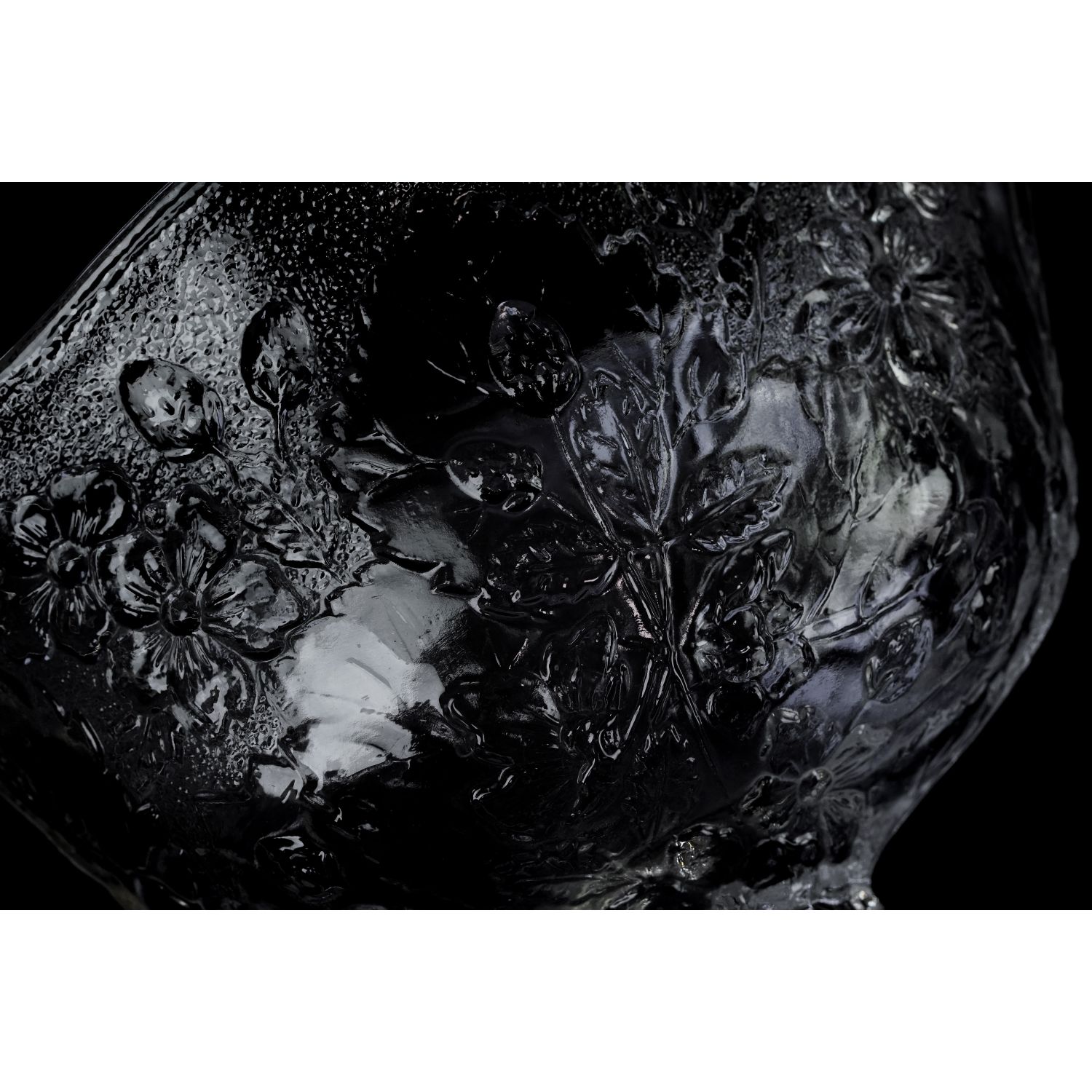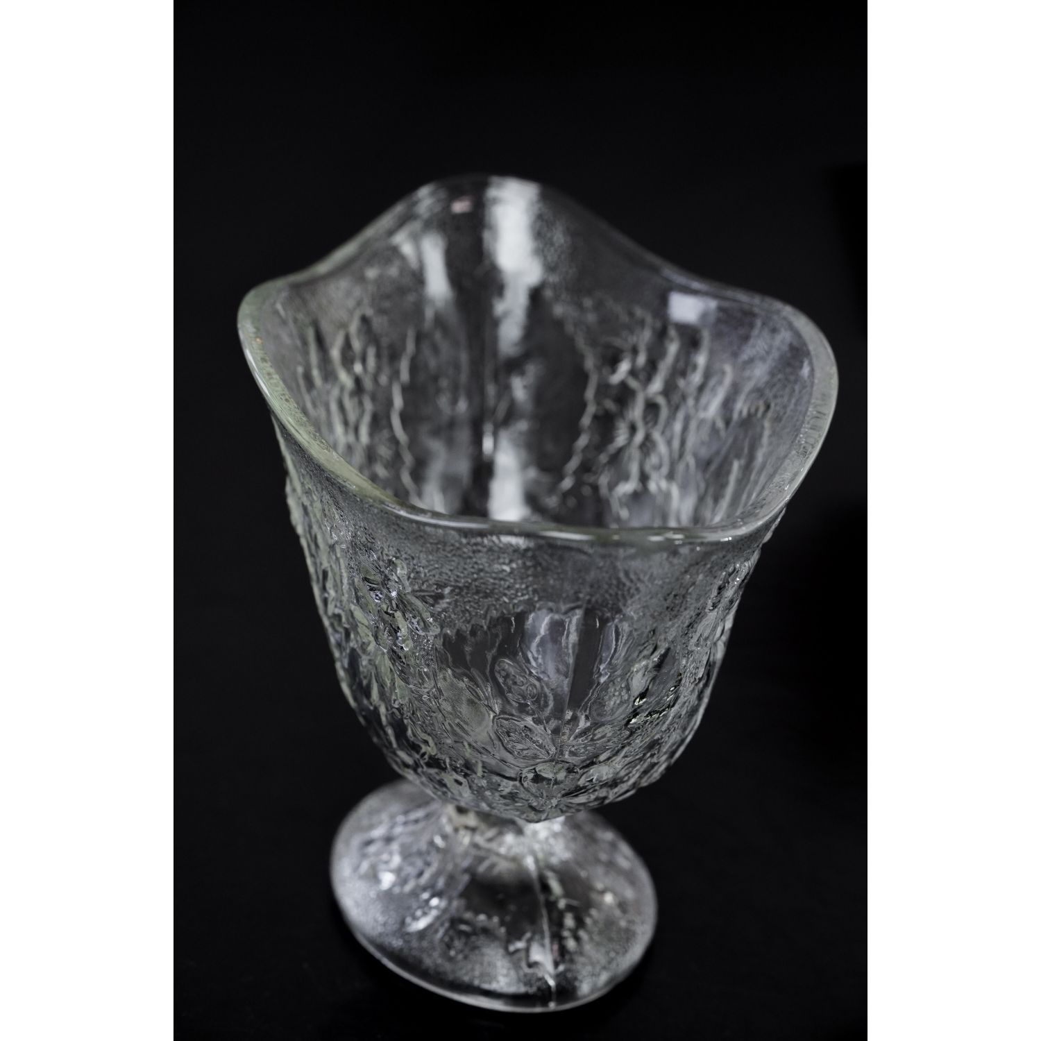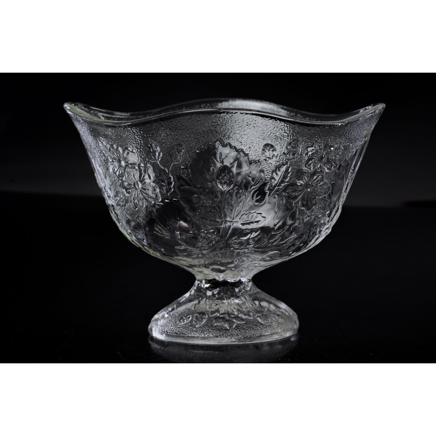 Wykonana ze szkła prasowanego przez hutę szkła Ząbkowice, model Strawberry, projekt Pani Eryki Trzewik-Drost z 1984 roku. Cała powierzchnia zdobiona tłoczeniami w kwiaty, poziomki (truskawki) i liście.