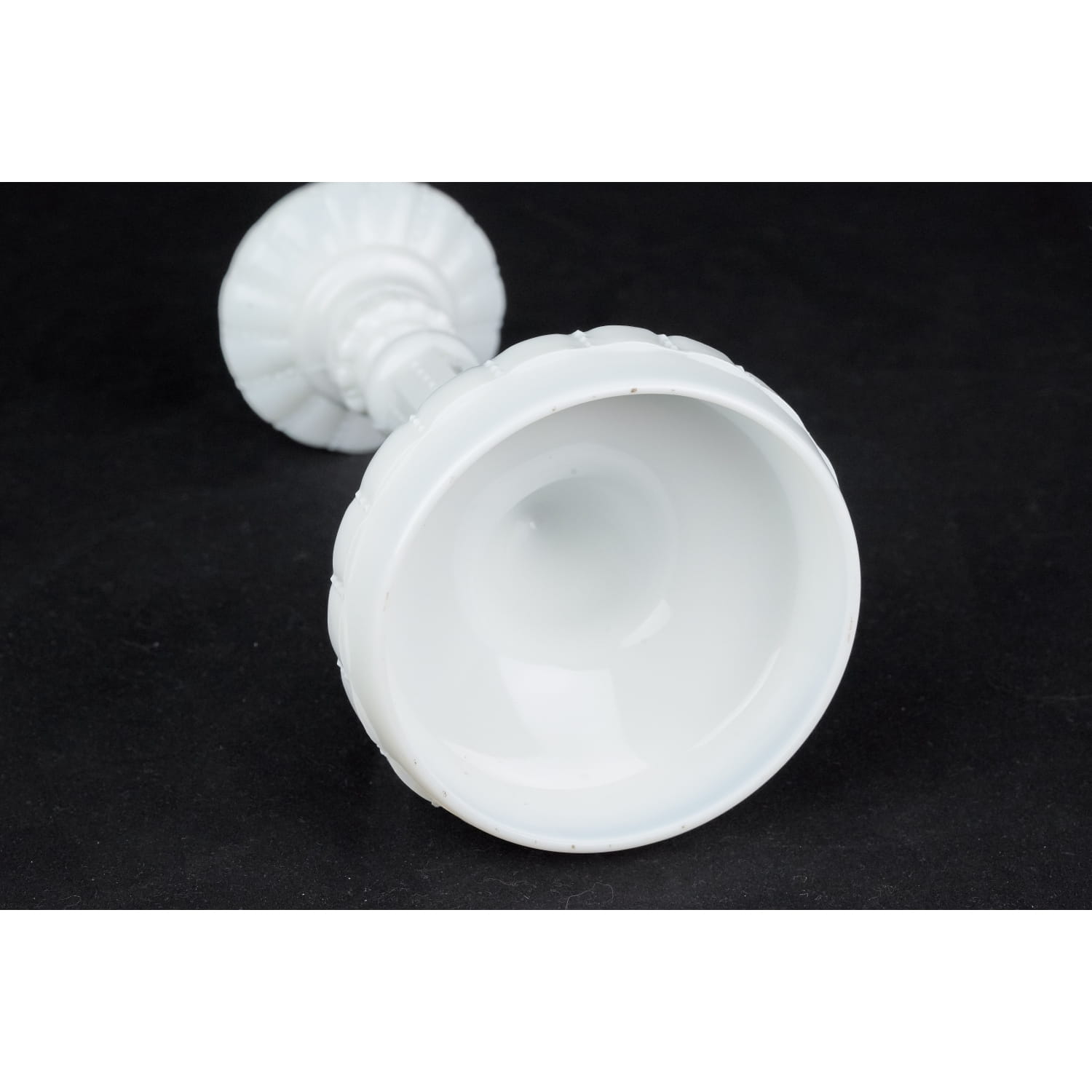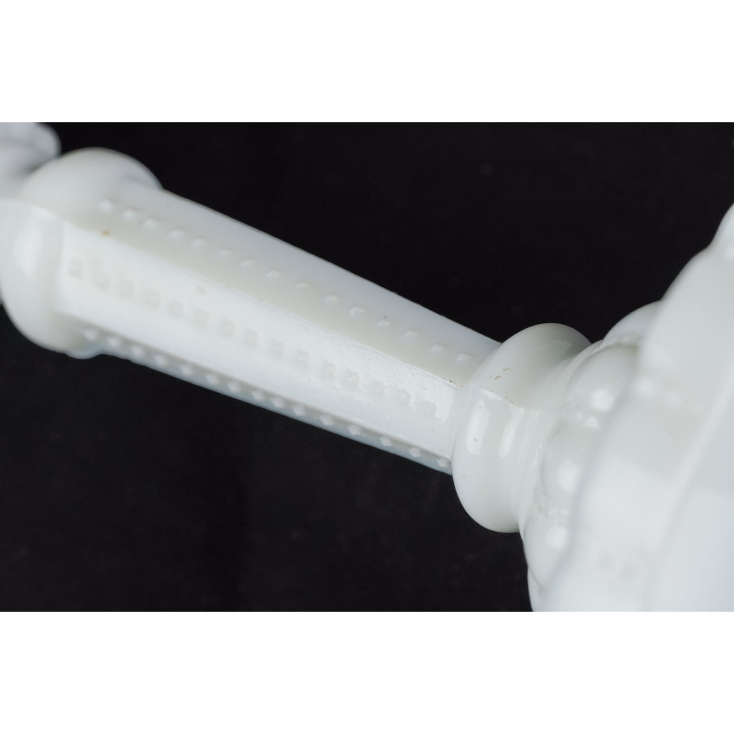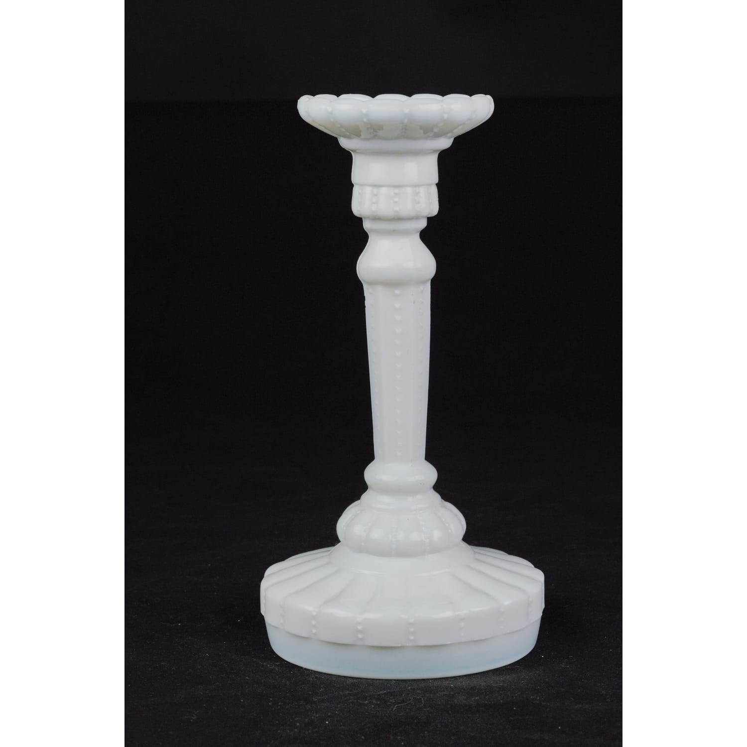 Stary świecznik kolumnowy, wykonany ze szkła prasowanego, w kolorze białym/mlecznym.