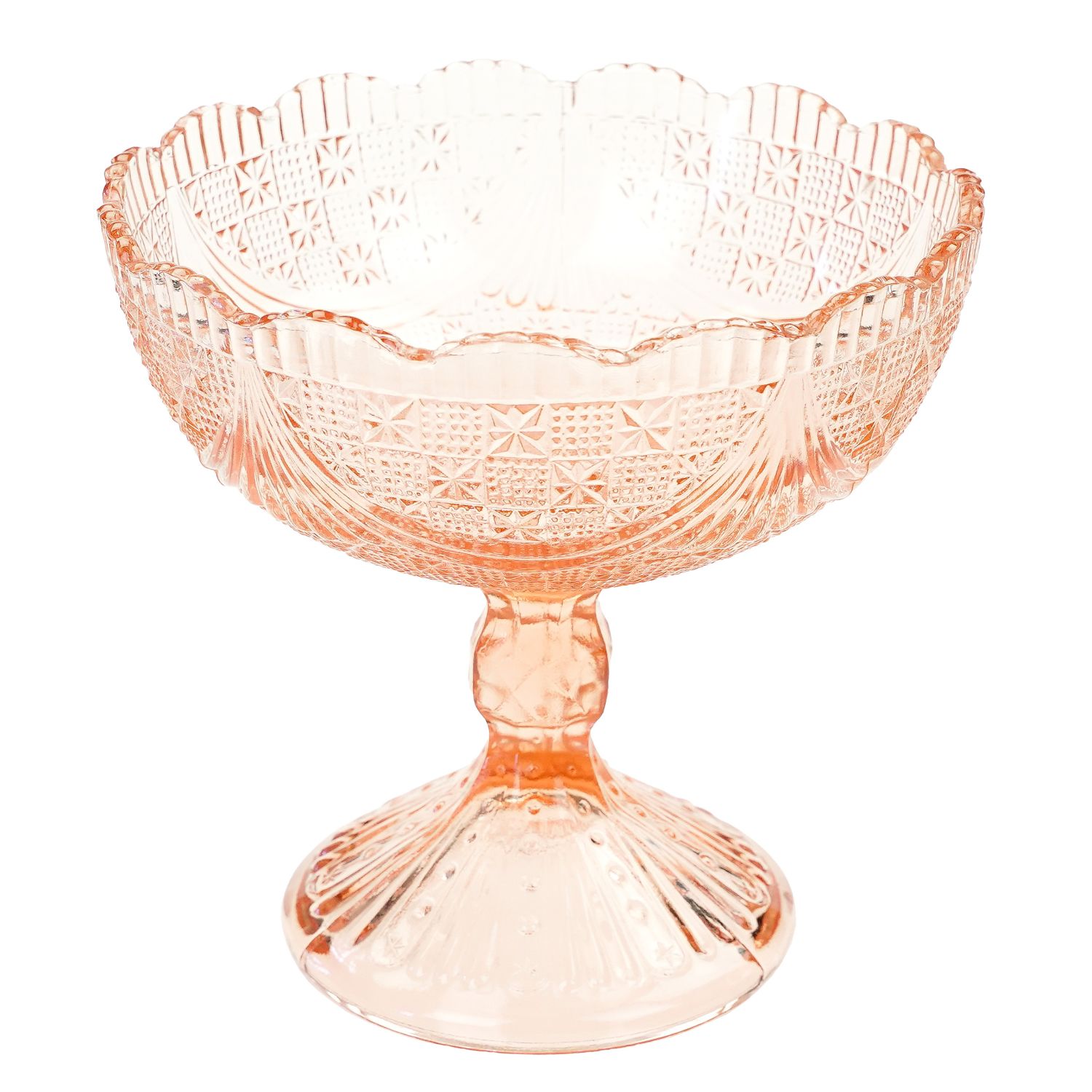 Wzór pochodzi z okresu międzywojennego z huty szkła Ząbkowice, numer katalogowy z 1910 roku, to 339. Szkło prasowane, w kolorze łososiowym, rant falowany. Cała powierzchnia patery tłoczona w gwiazdki i girlandy. Stopa też tłoczona.