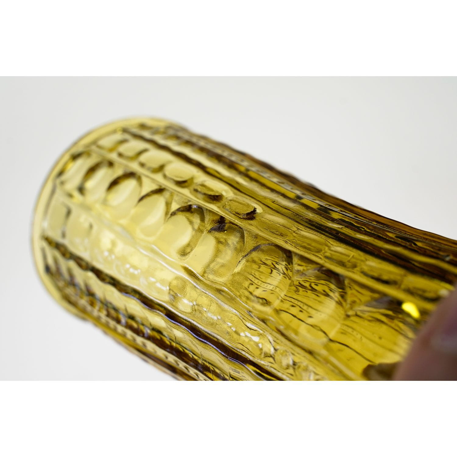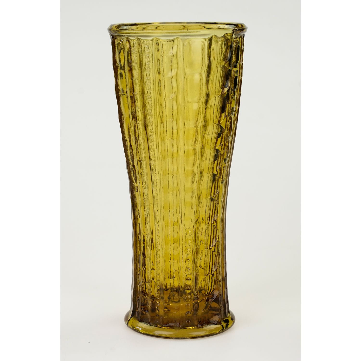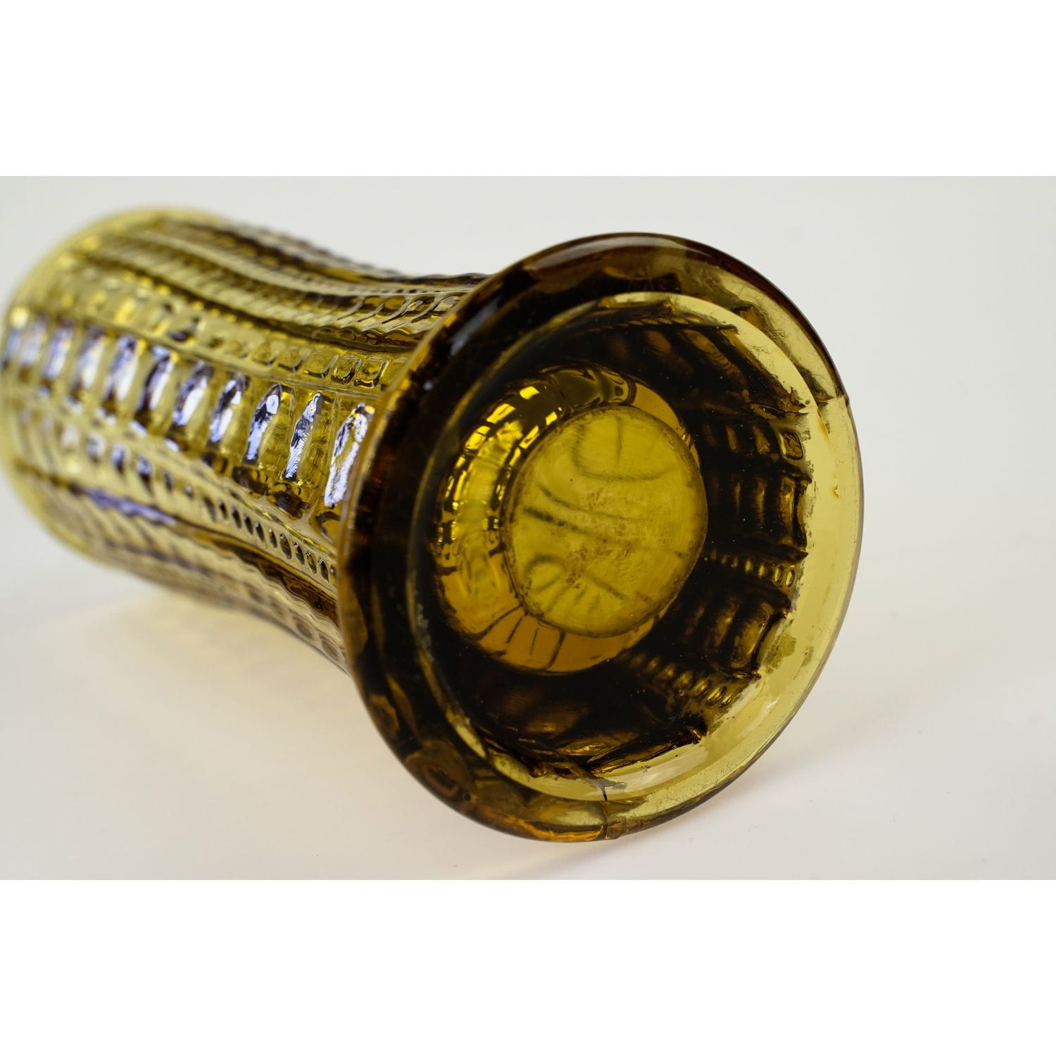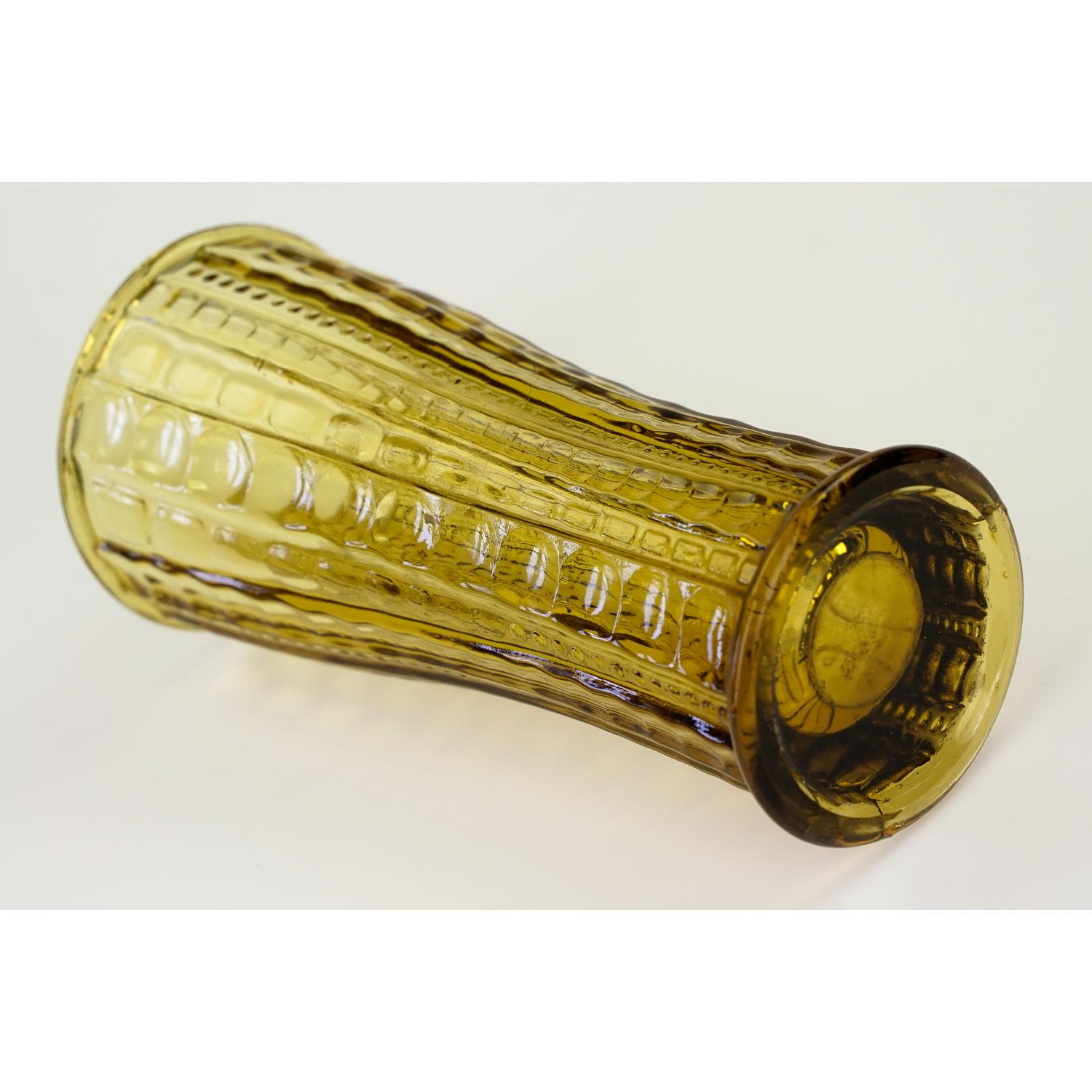 Wydaje mi się, że autorami projektu są Państwo Drostowie. Szkło prasowane, barwione w masie na piękny, miodowy kolor. Prosta forma, na całej powierzchni tłoczenia w geometryczny wzorek: oliwki, guziczki i prostokąty różnej wielkości. Świetny przykład polskiego wzornictwa z lat 70-tych XX wieku.