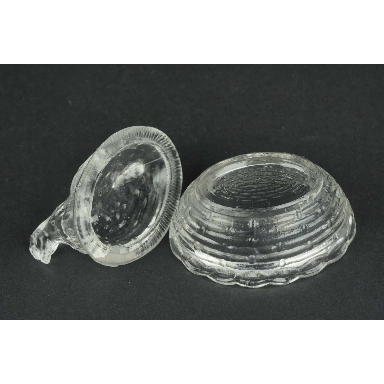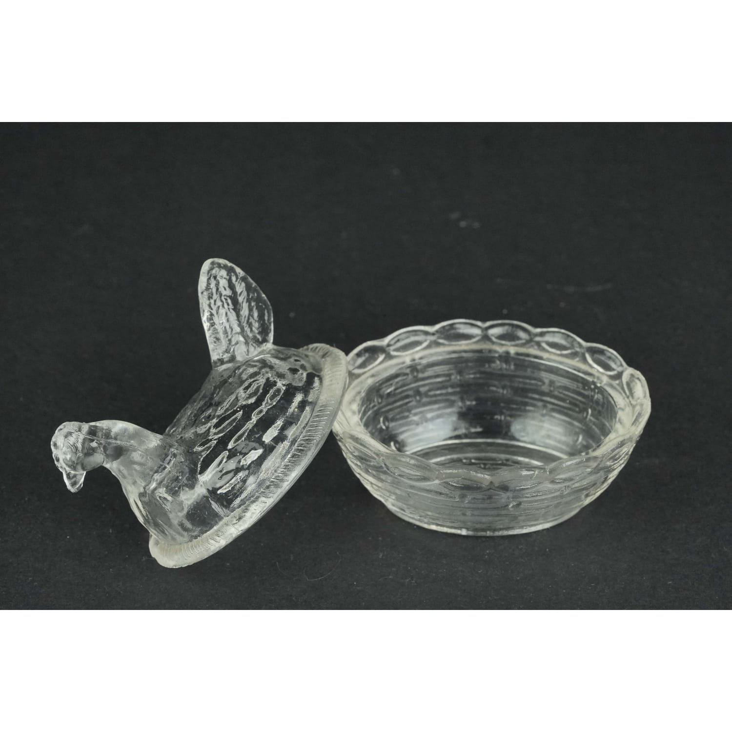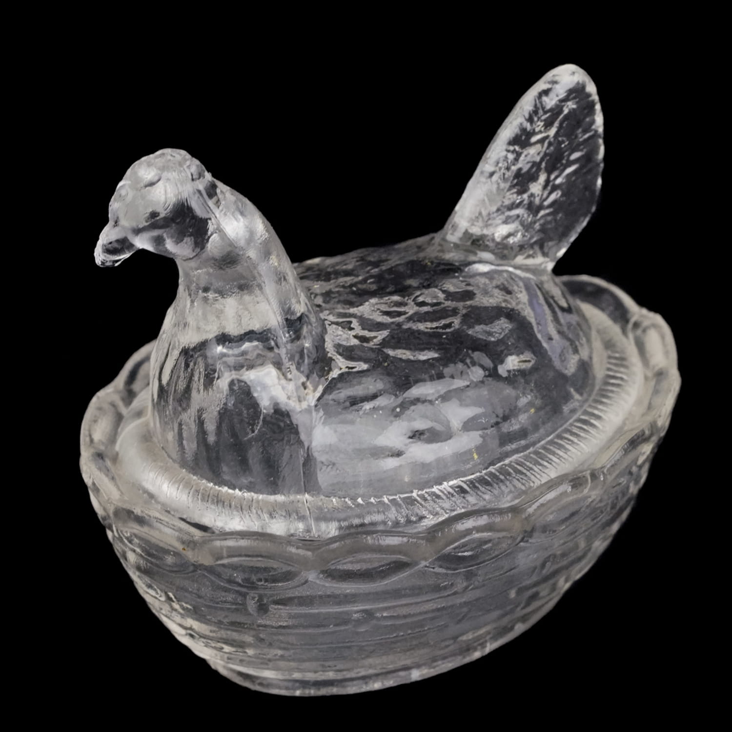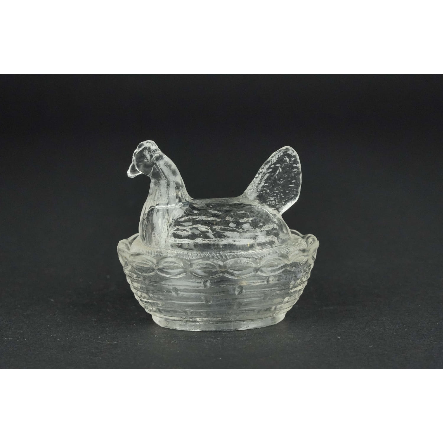 Piękna, malutka kurka ze szkła w kolorze prasowanego, bezbarwnego.