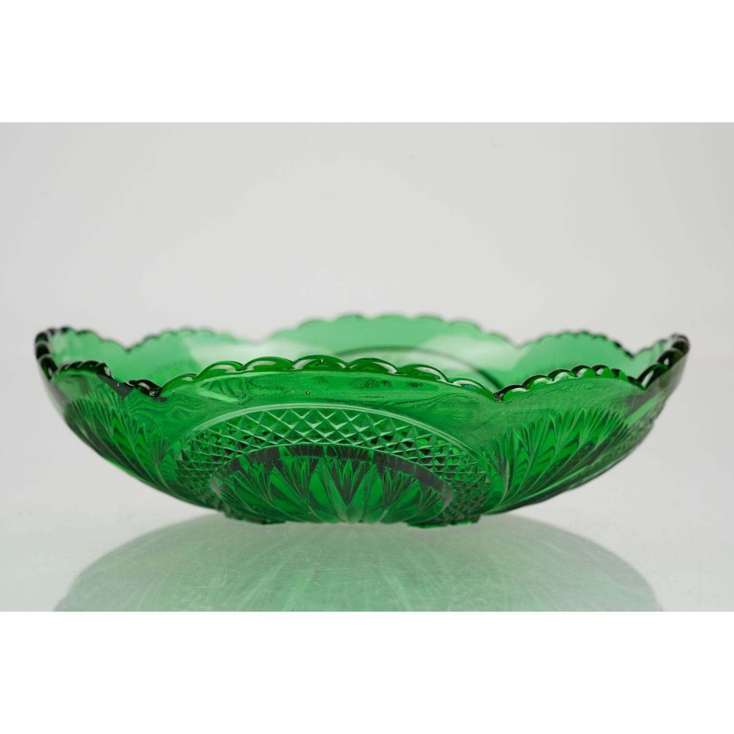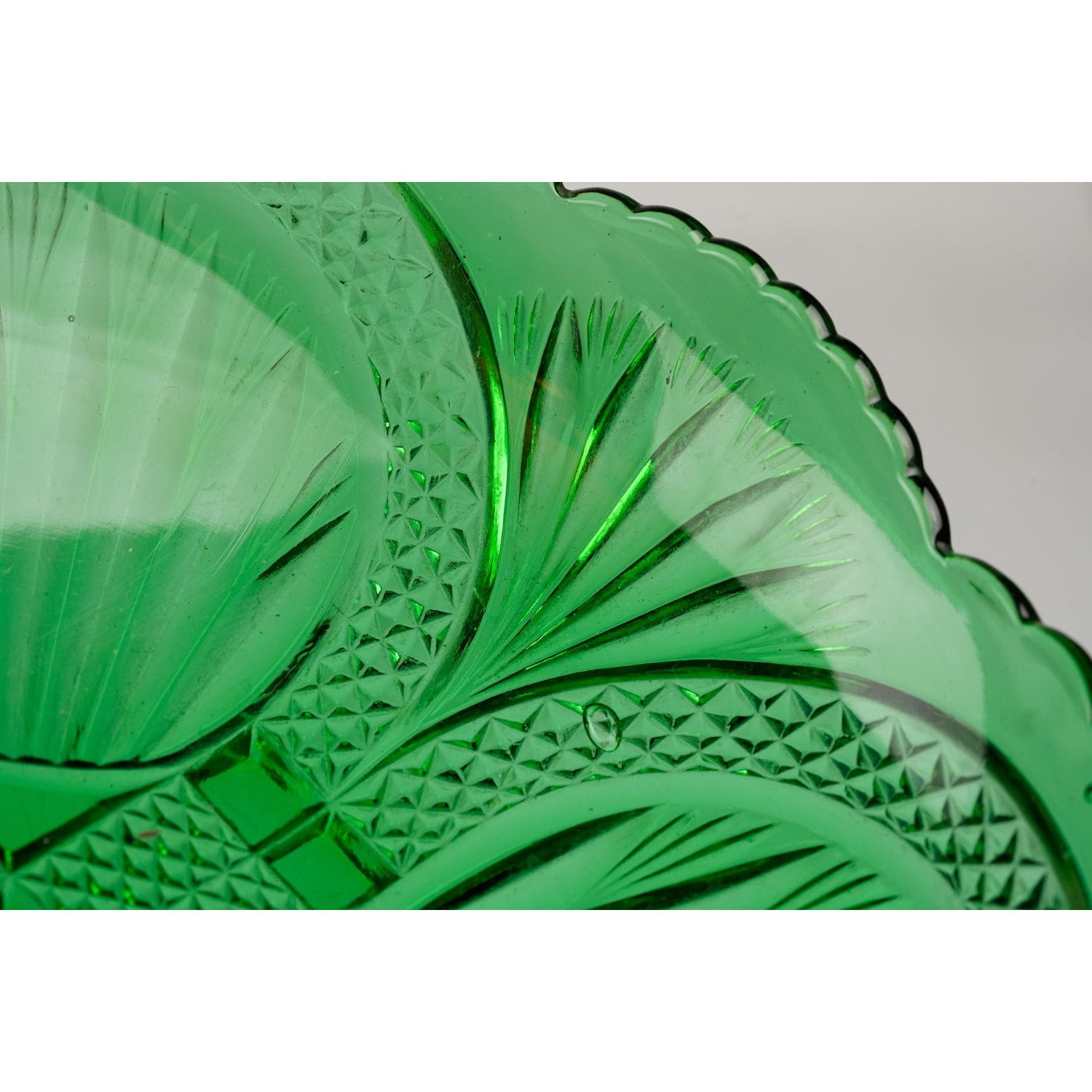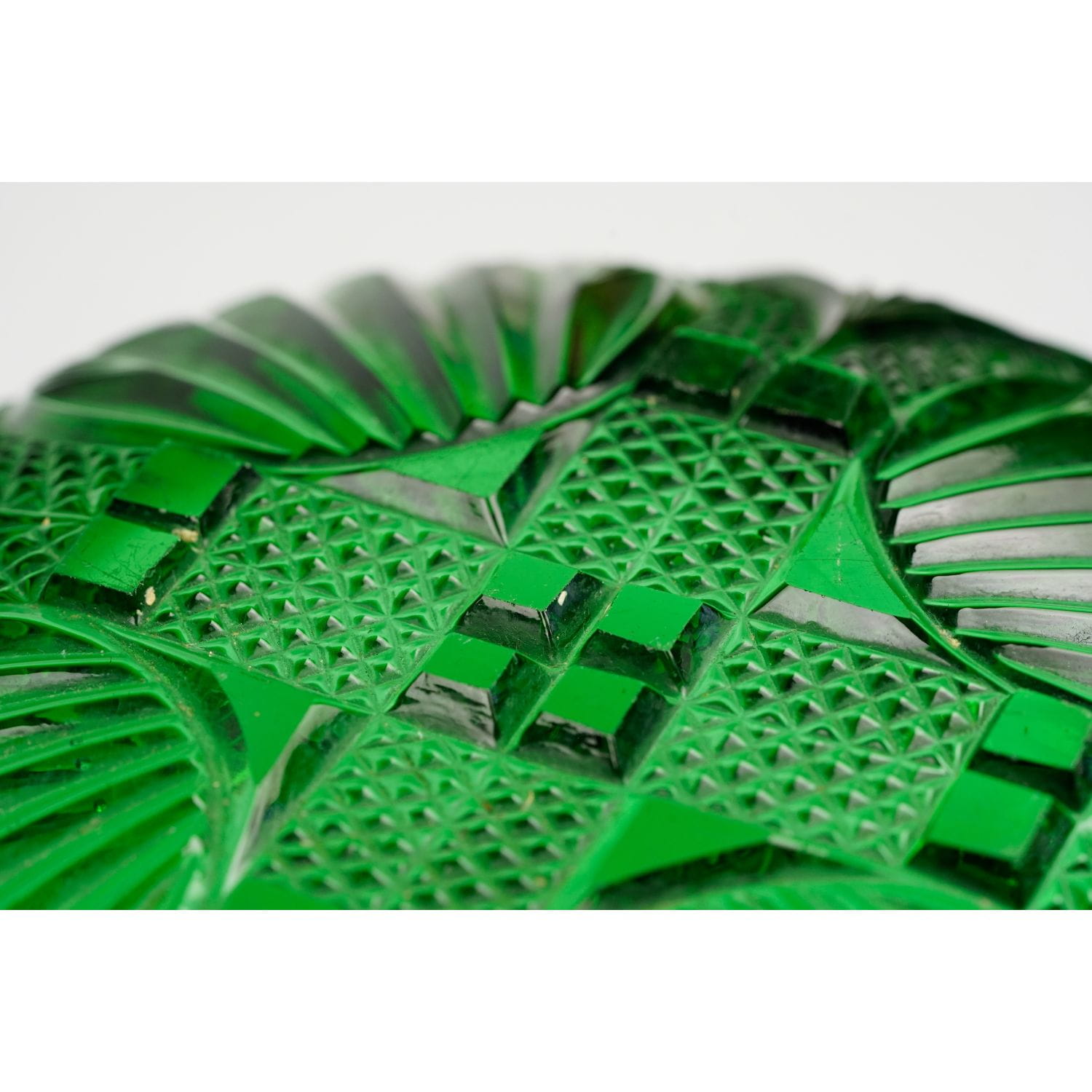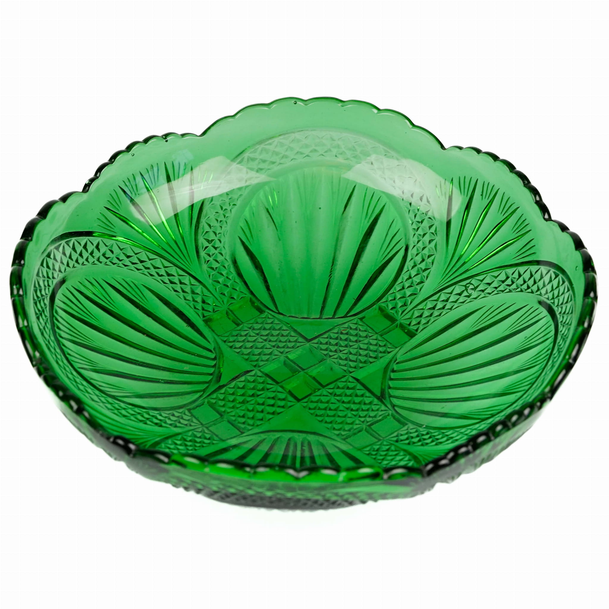 Pochodzi z huty szkła Ząbkowice, numer katalogowy z 1920 roku, to 1226, nazwa modelu Verre Brillant. Szkło prasowane, w przyjemnym, szmaragdowym kolorze. Bogato dekorowane tłoczeniami, osadzone na dwunastu maleńkich nóżkach.