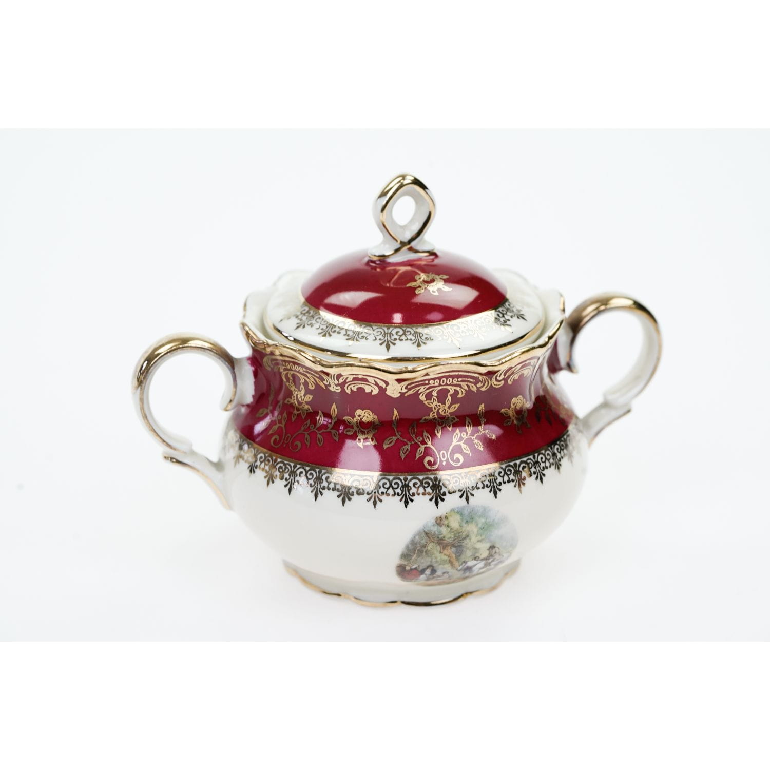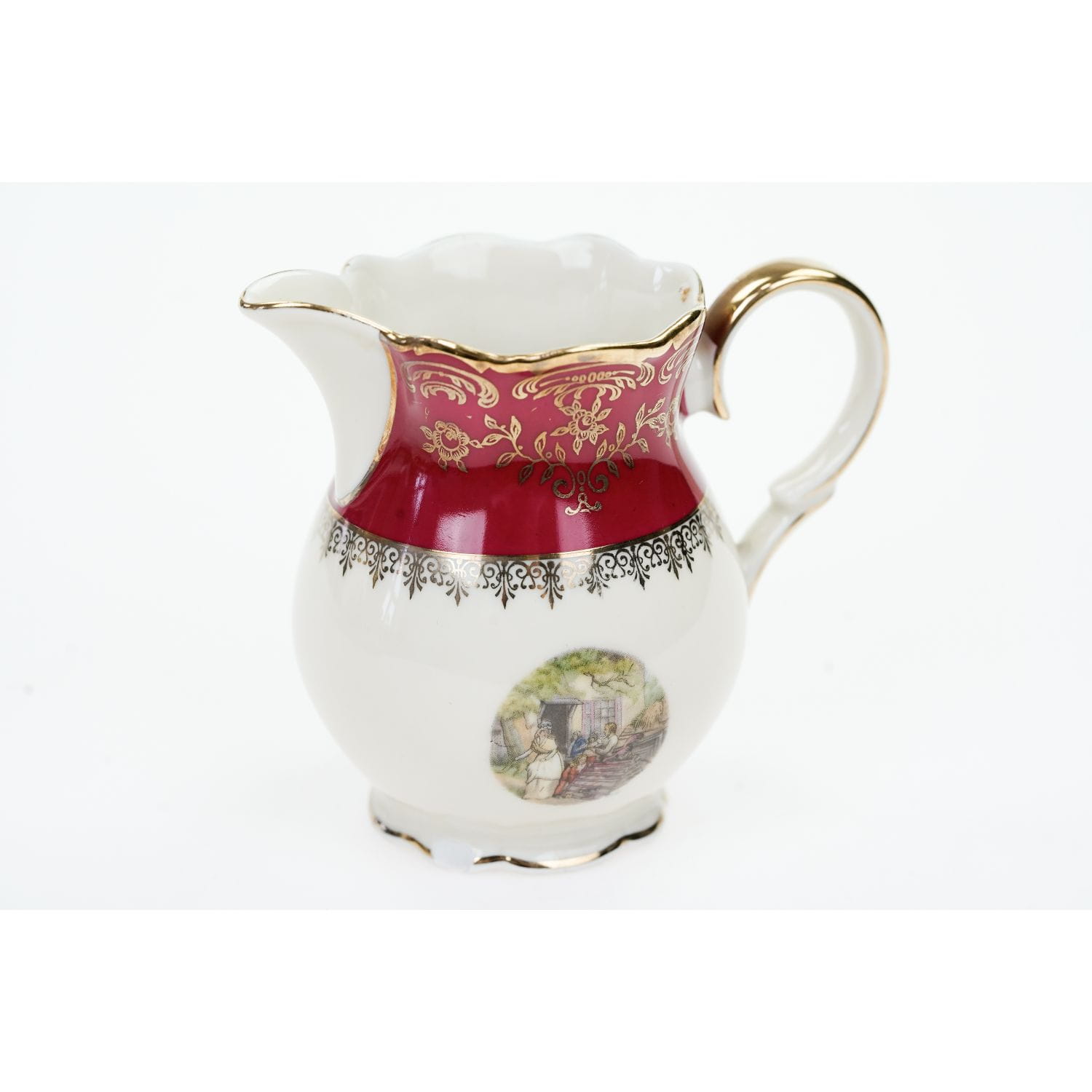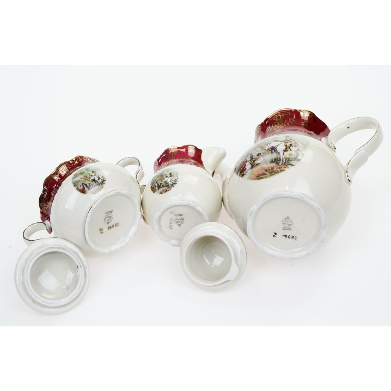 Pochodzi z Rehau z Porzellanfabrik Zeh, Scherzer & Co. AG. Sygnowany znakiem stosowanym po 1949 roku. Piękna porcelana w kolorze kości słoniowej z bordowym szlaczkiem, pokrytym złotymi, kwiatowymi ornamentami. W dolnej części naczynia zdobione kalkomanią ze scenką rodzajową. Grubo złocone uszka i sterczynki. Ranty w cieniuteńkich złoceniach.