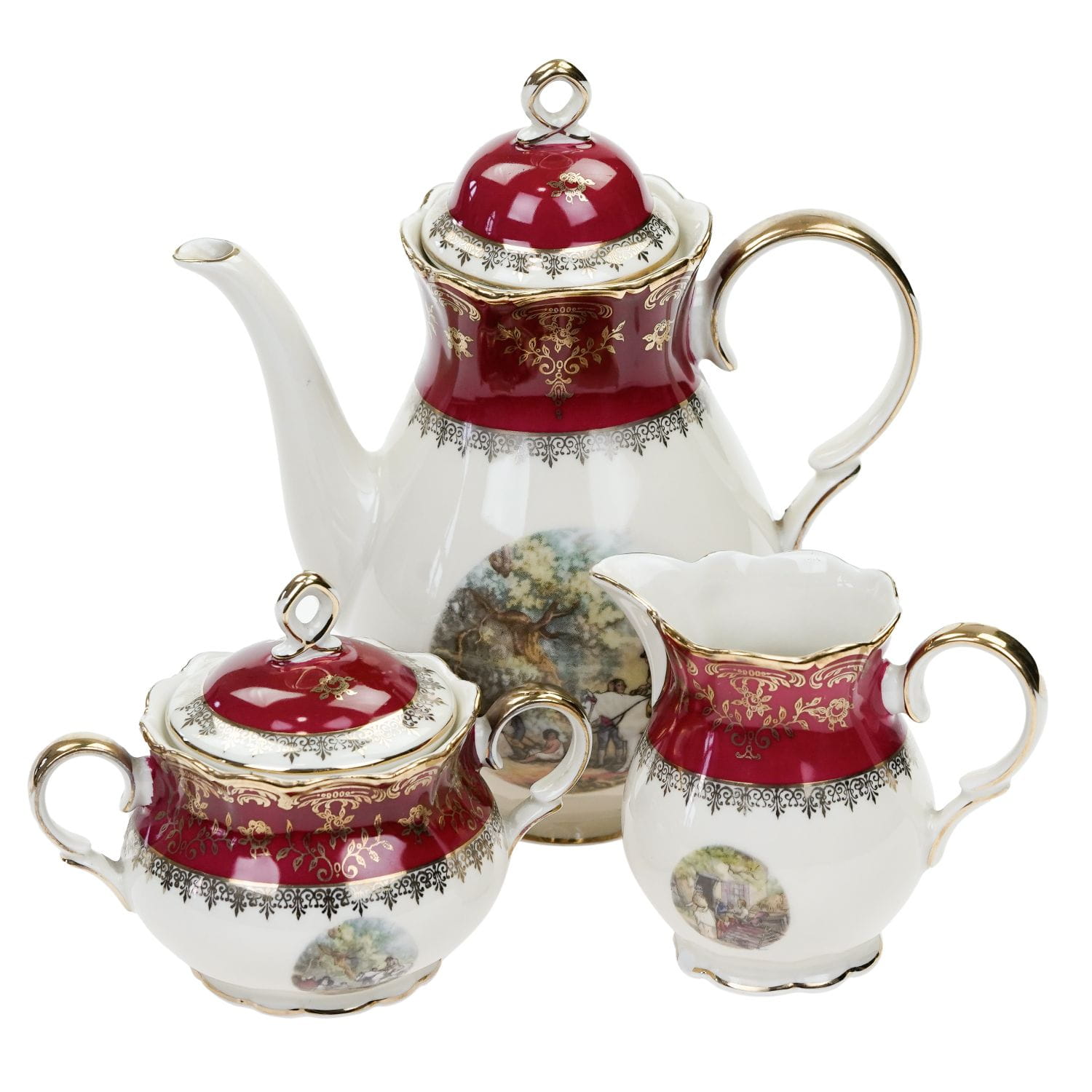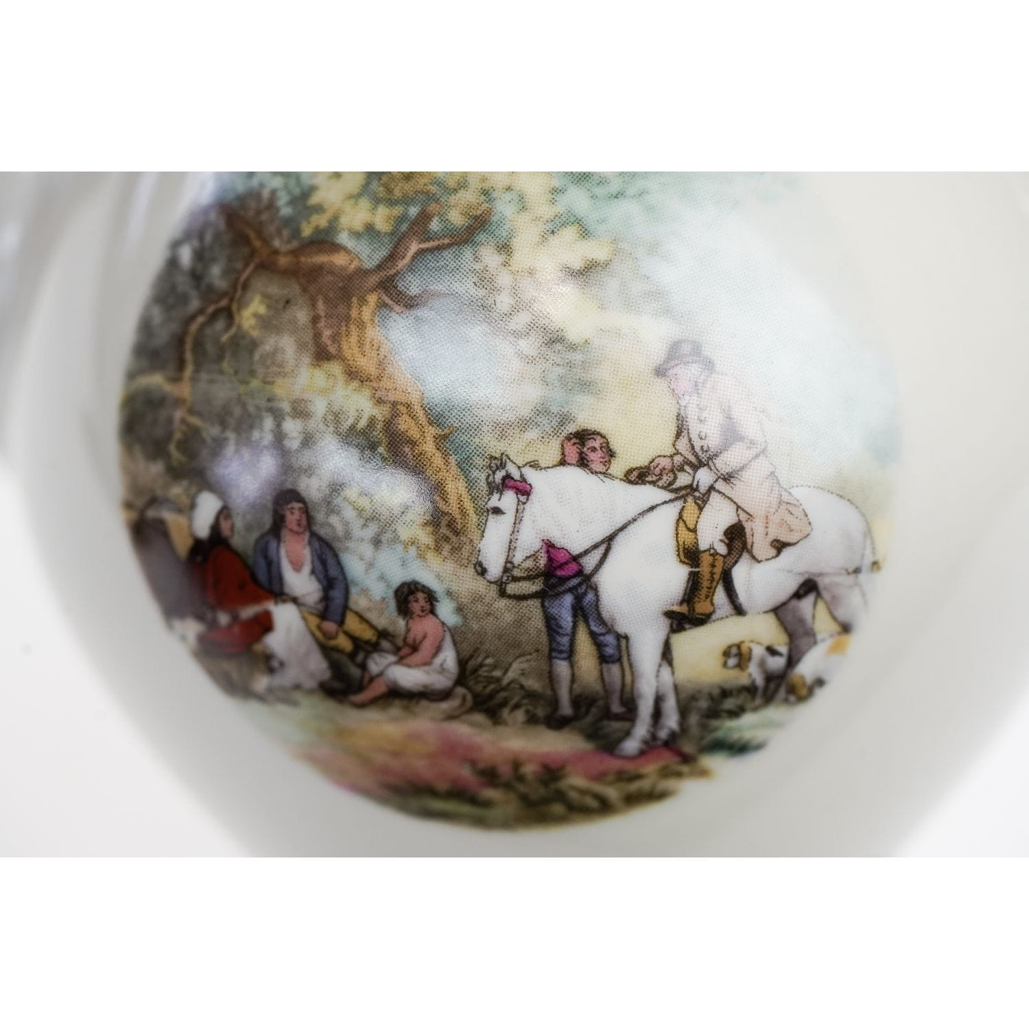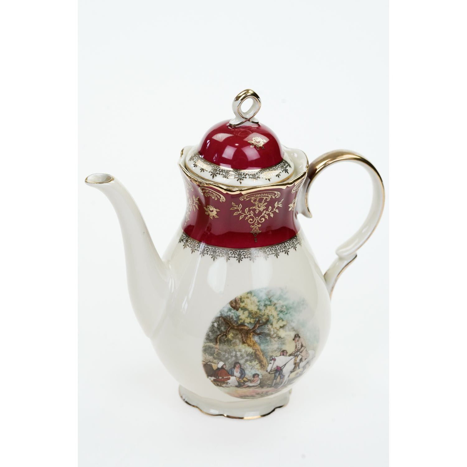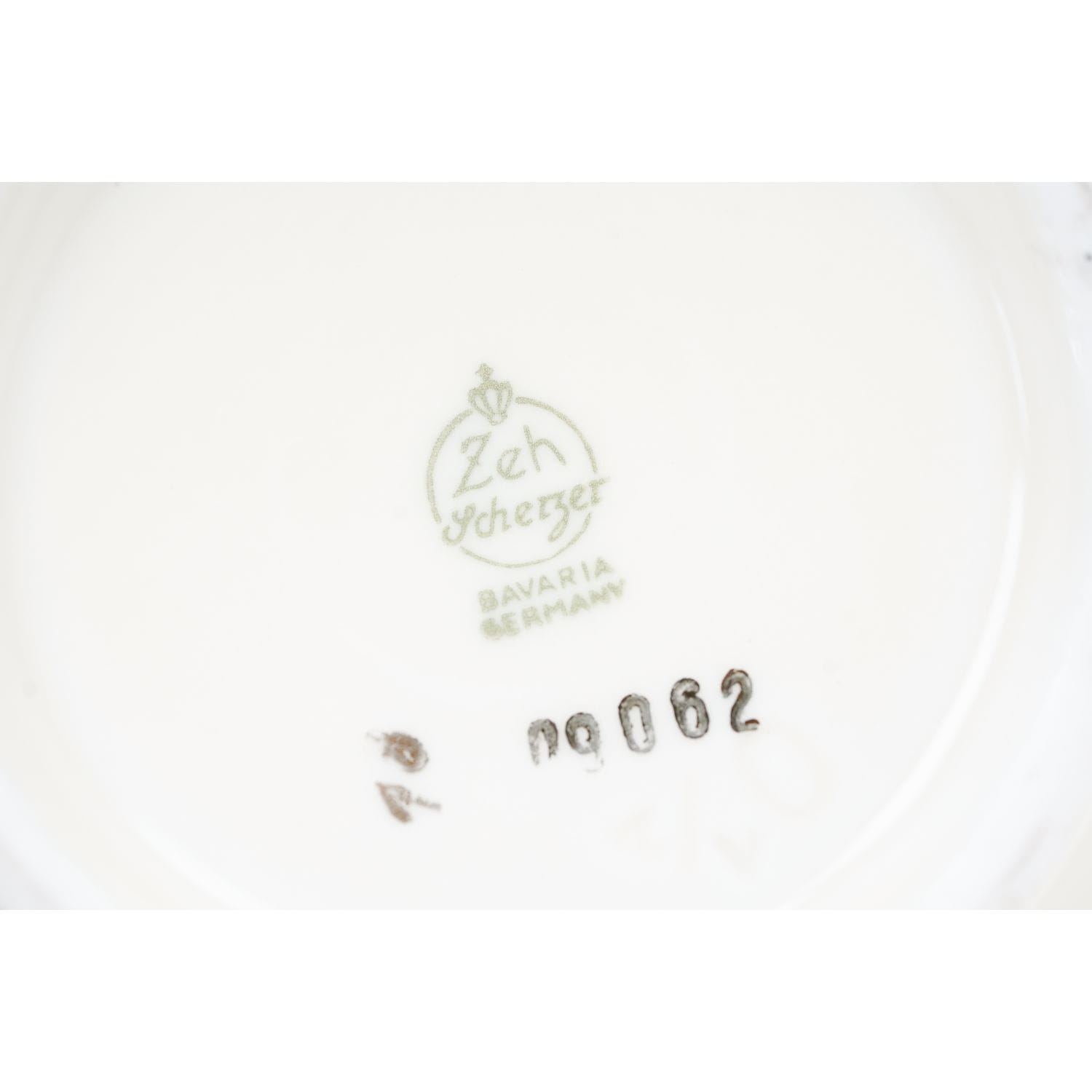 Pochodzi z Rehau z Porzellanfabrik Zeh, Scherzer & Co. AG. Sygnowany znakiem stosowanym po 1949 roku. Piękna porcelana w kolorze kości słoniowej z bordowym szlaczkiem, pokrytym złotymi, kwiatowymi ornamentami. W dolnej części naczynia zdobione kalkomanią ze scenką rodzajową. Grubo złocone uszka i sterczynki. Ranty w cieniuteńkich złoceniach.