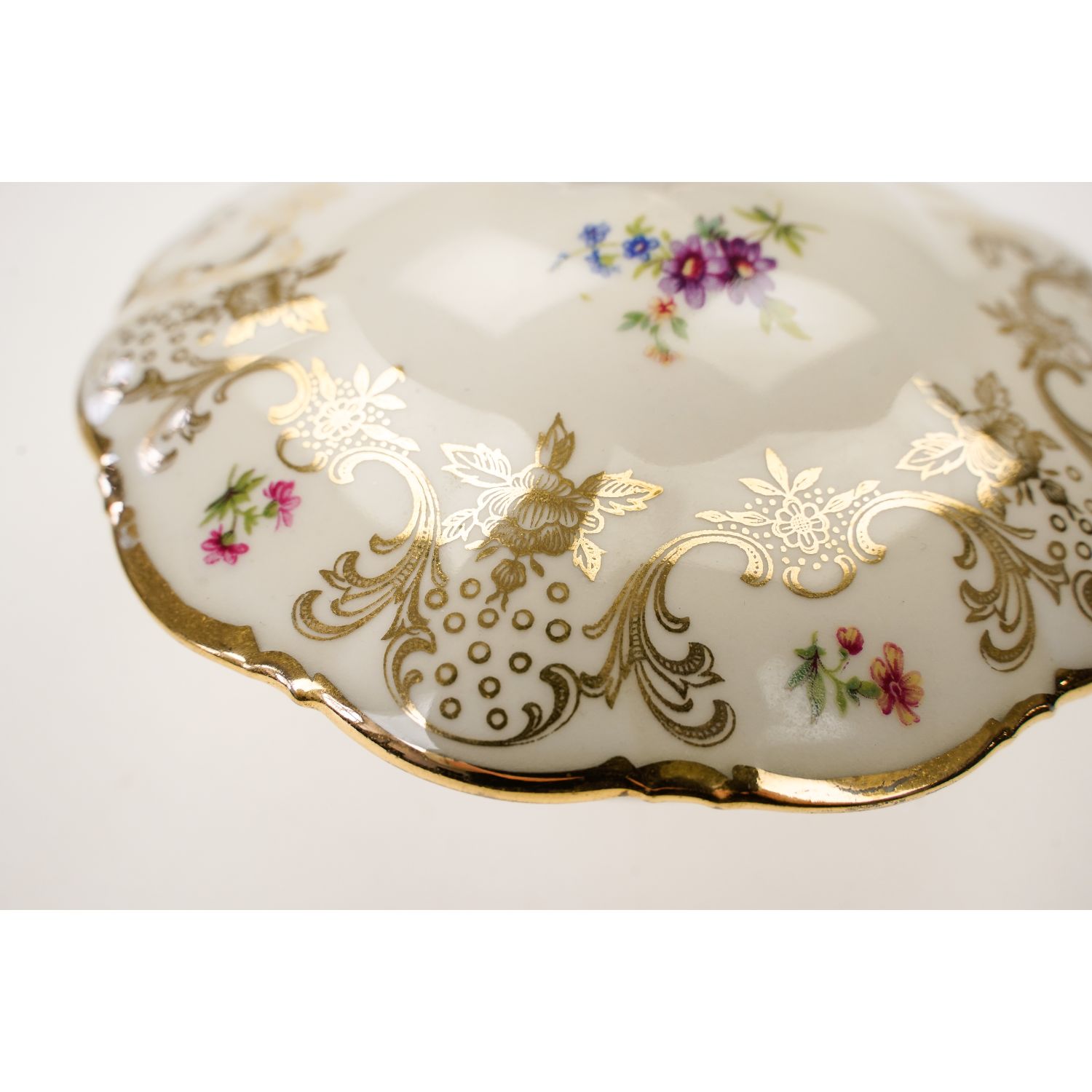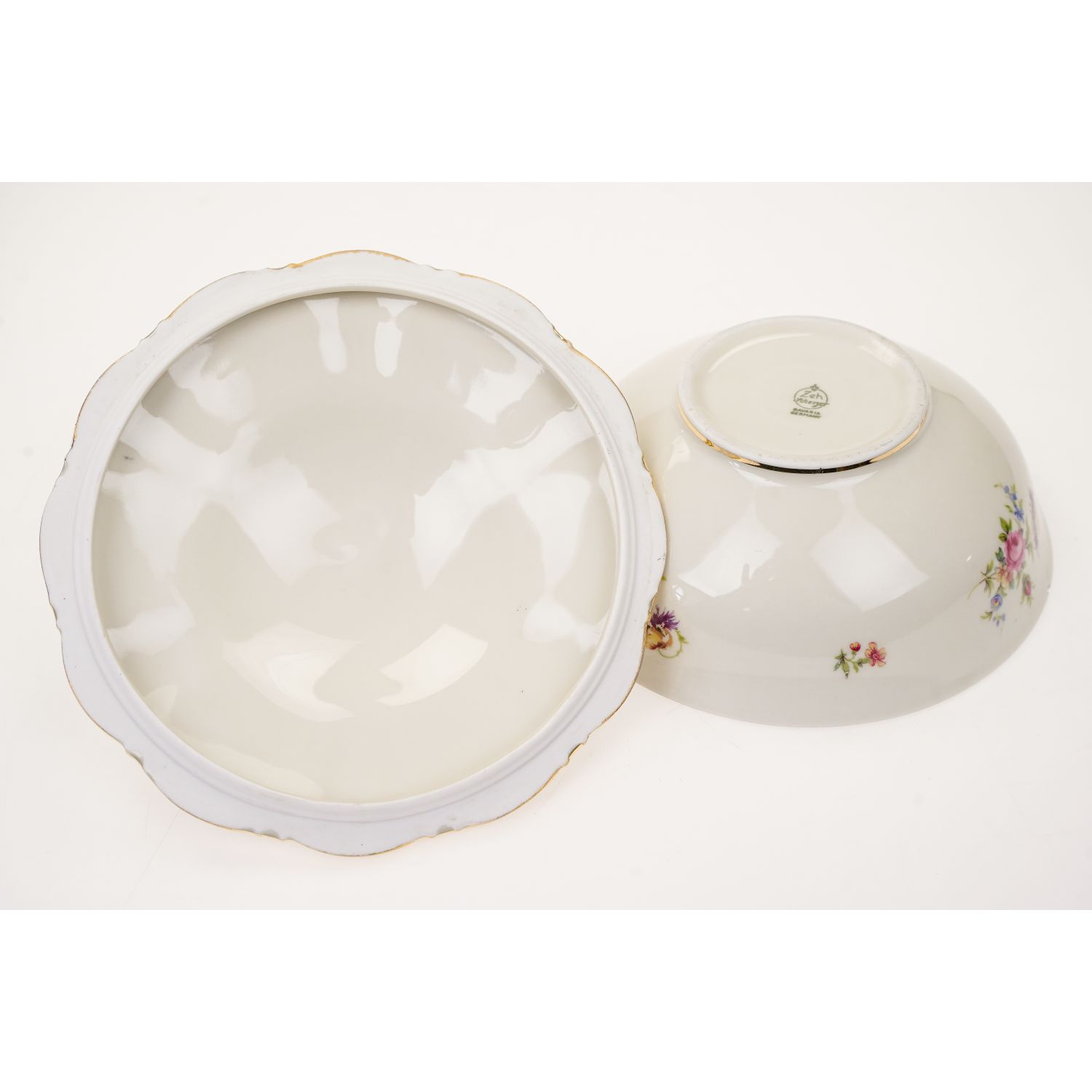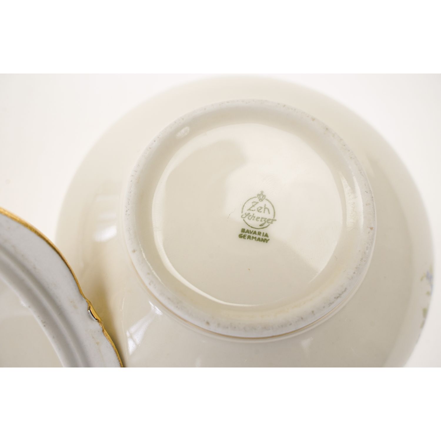 Pochodzi z Rehau z Porzellanfabrik Zeh, Scherzer & Co. AG. Sygnowana znakiem stosowanym po 1949 roku. Piękna porcelana w kolorze kości słoniowej zdobiona cudownymi złotymi kwiatowymi ornamentami i barwnymi, drobniutkimi kwiatuszkami. Sterczynka w kształcie pętelki, złocona grubo, tak jak i uszka. Ranty w cieniuteńkich złoceniach.