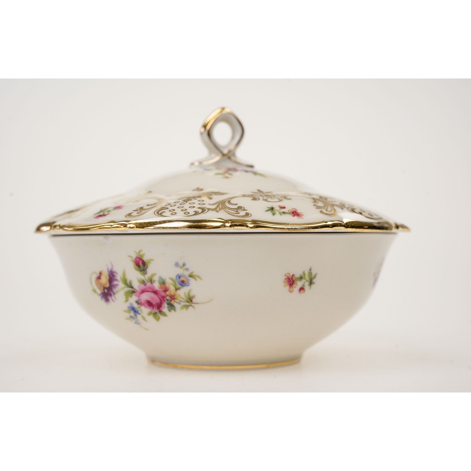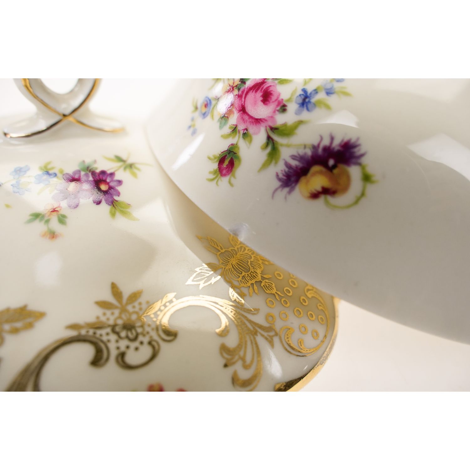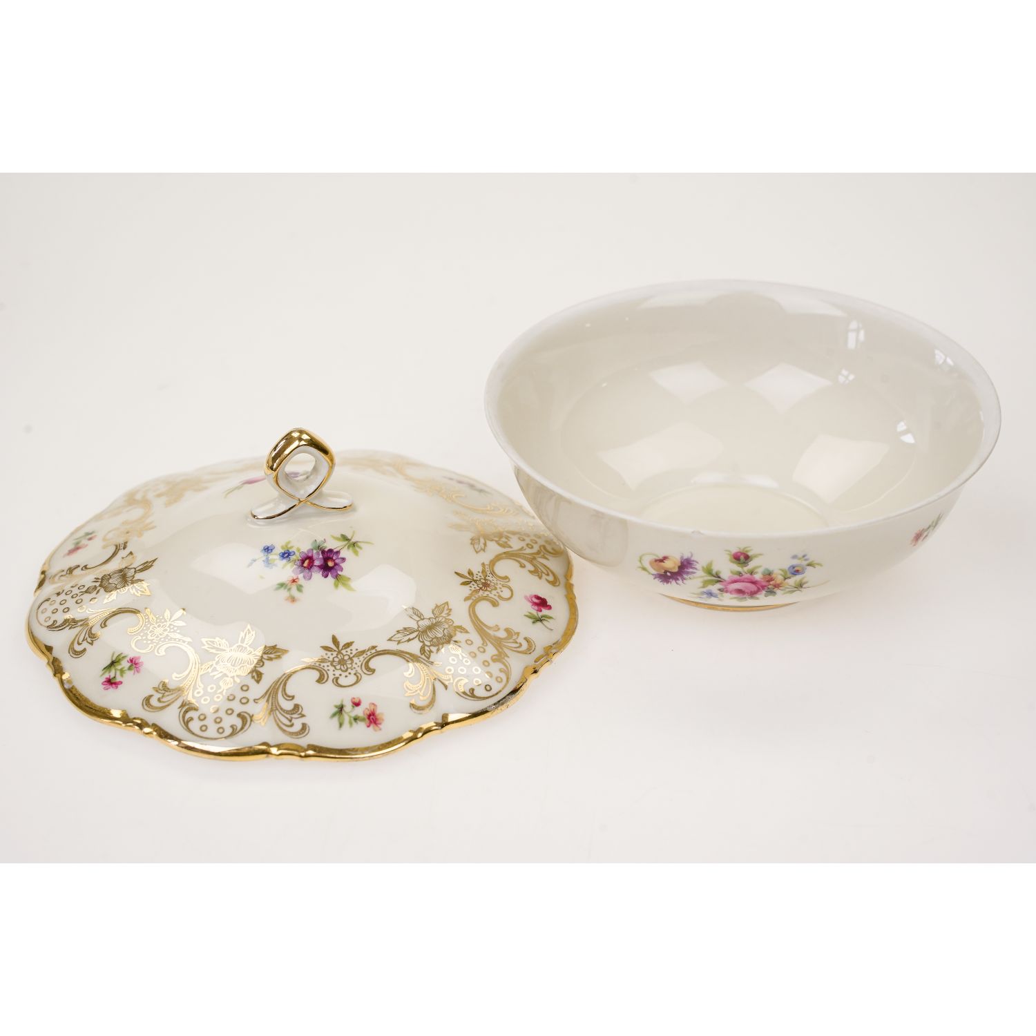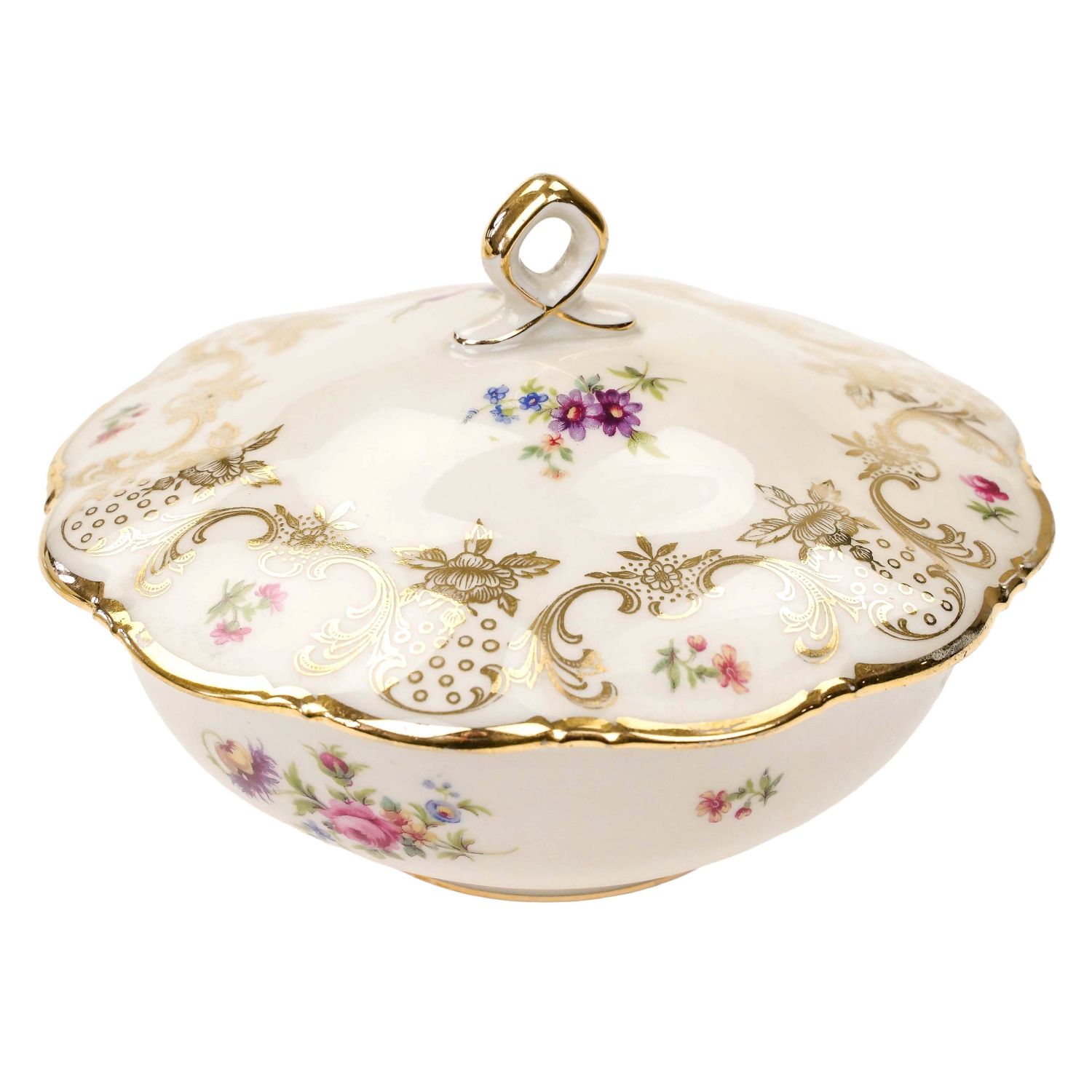 Pochodzi z Rehau z Porzellanfabrik Zeh, Scherzer & Co. AG. Sygnowana znakiem stosowanym po 1949 roku. Piękna porcelana w kolorze kości słoniowej zdobiona cudownymi złotymi kwiatowymi ornamentami i barwnymi, drobniutkimi kwiatuszkami. Sterczynka w kształcie pętelki, złocona grubo, tak jak i uszka. Ranty w cieniuteńkich złoceniach.
