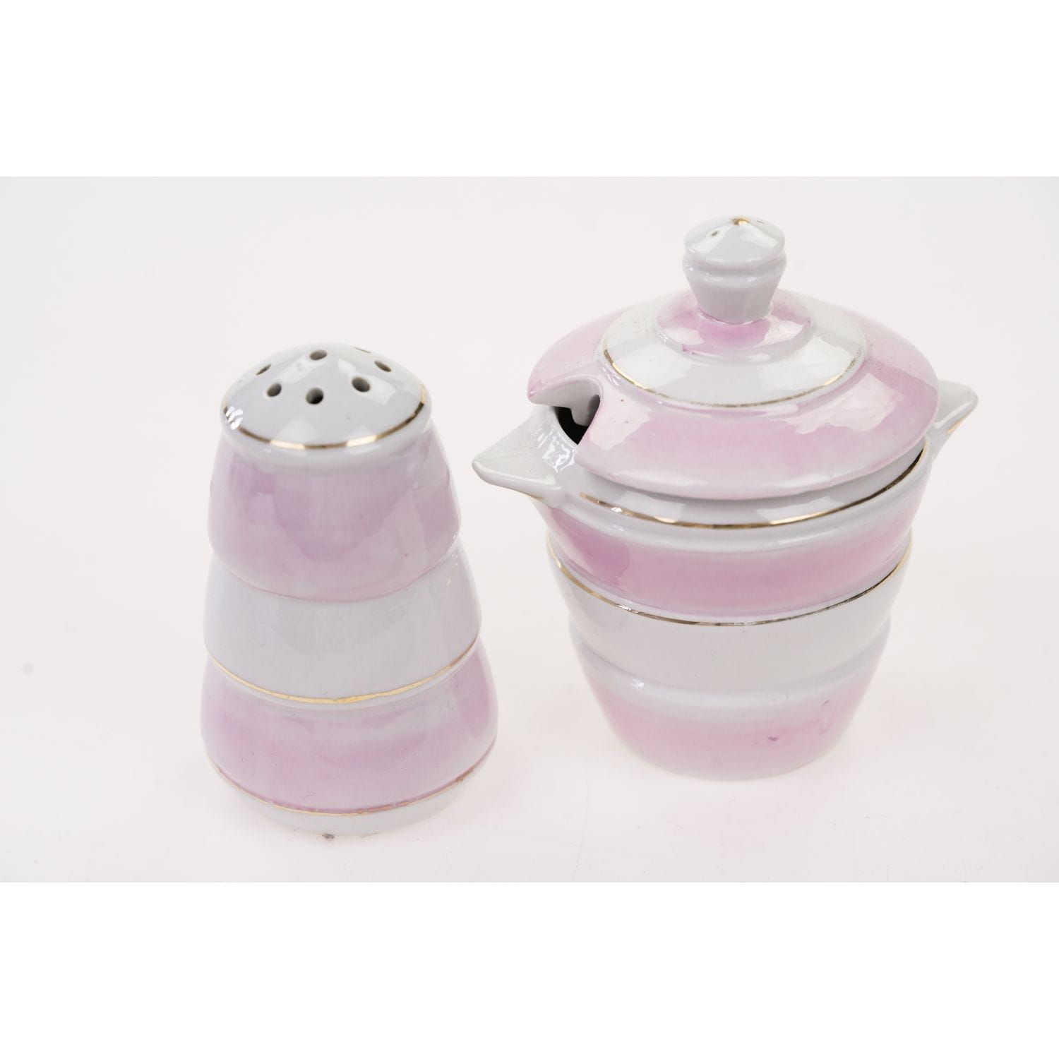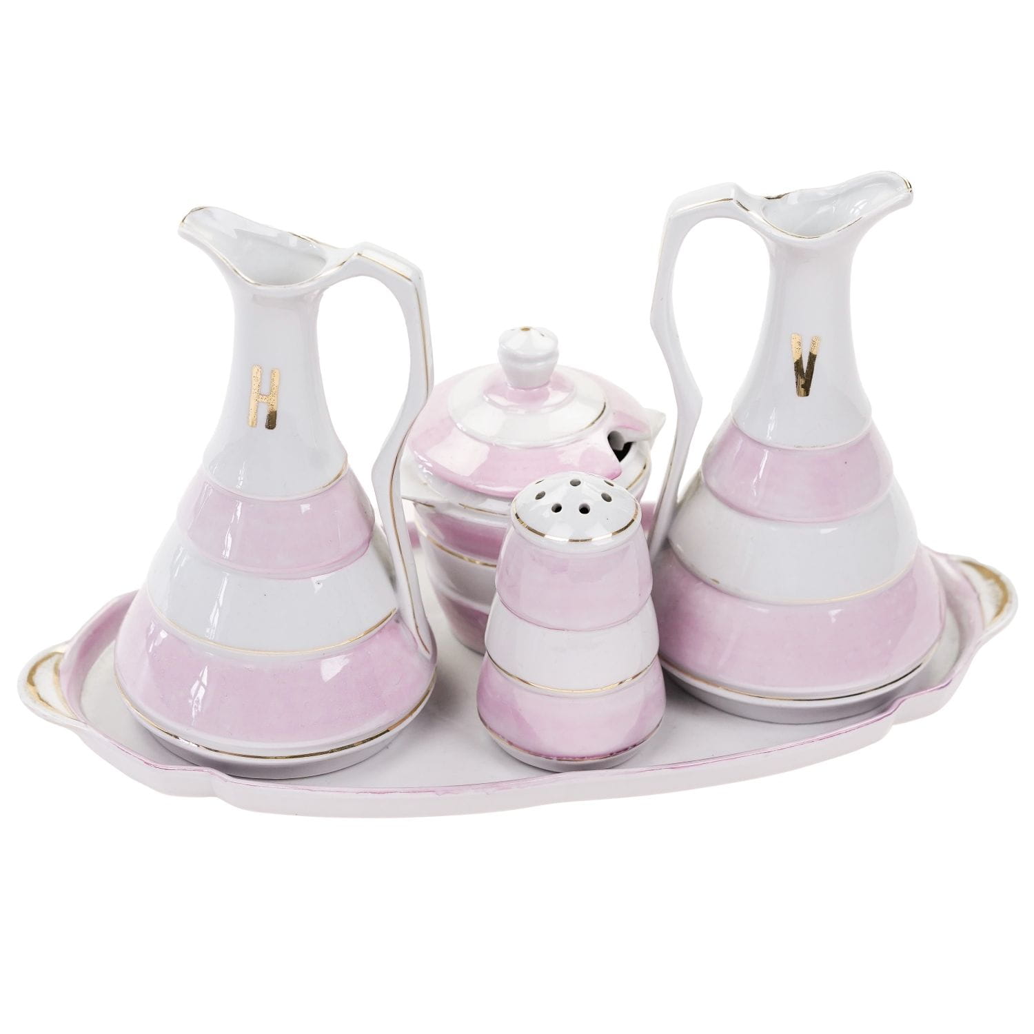 Sygnowany jedynie numerycznym wyciskiem w masie. Wykonany z porcelany w odcieniu bieli zdobionej różowymi pasami. Kontury w złoceniu. Zestaw składa się z tacy, dwóch karafek na ocet i olej, solniczki i musztardniczki.