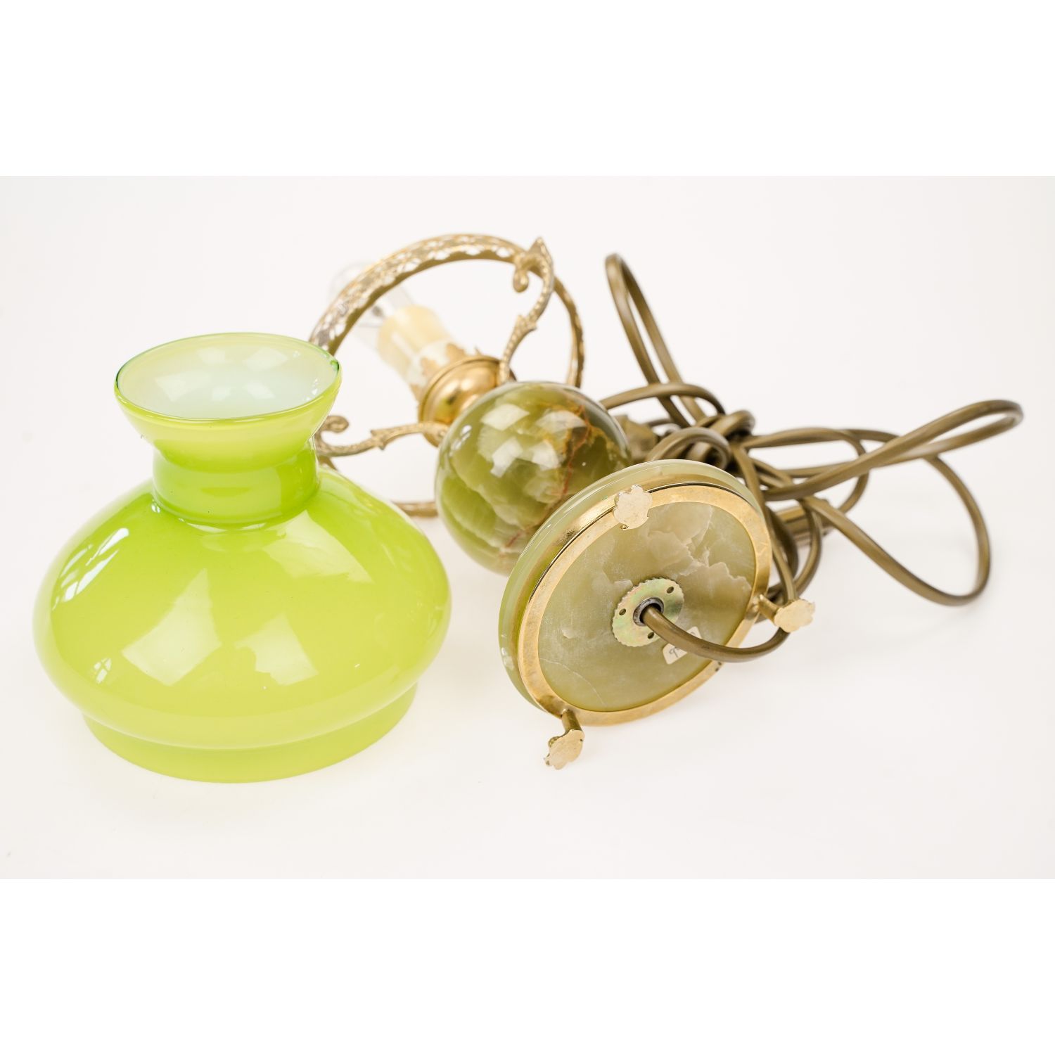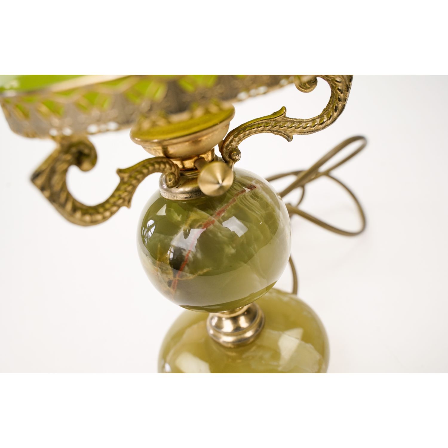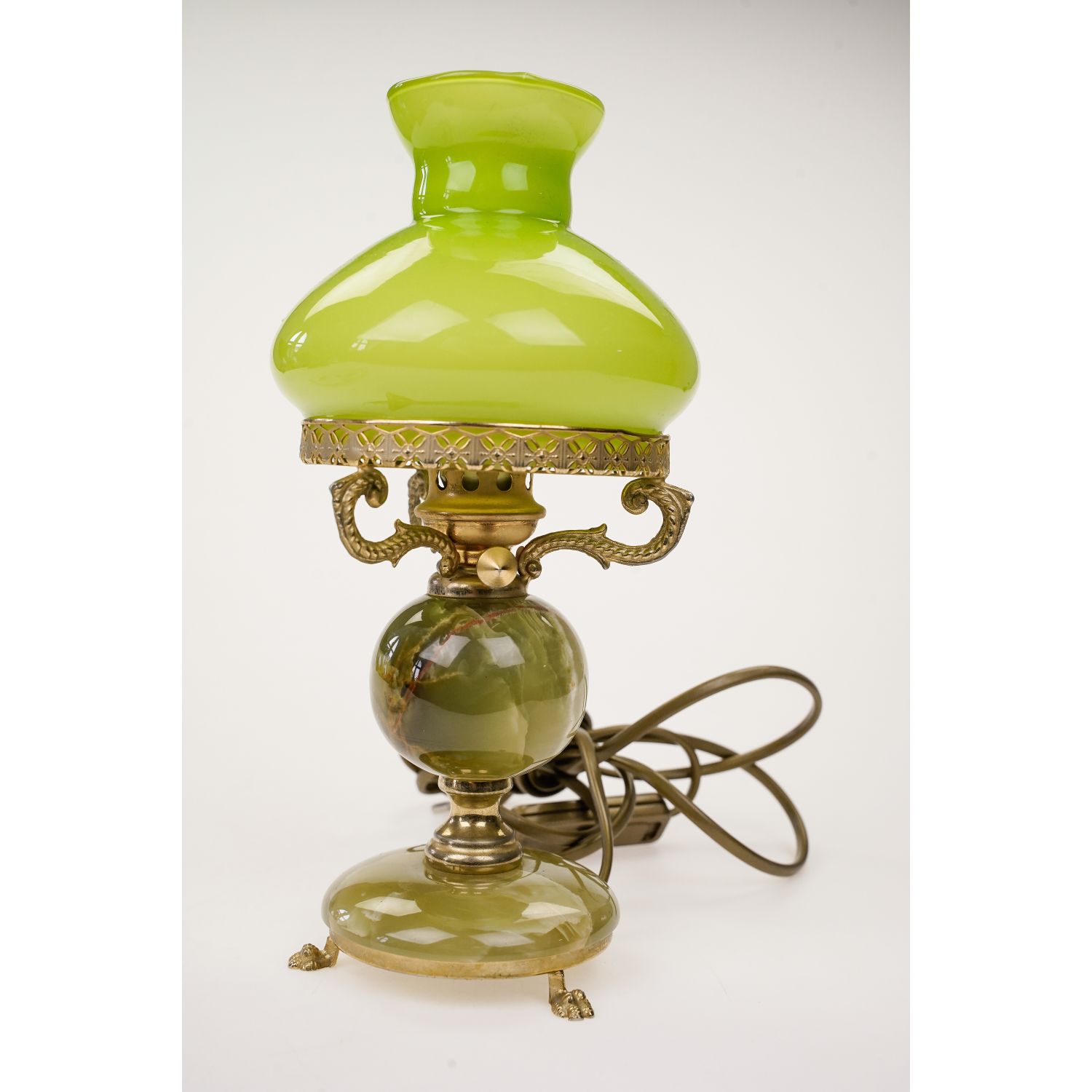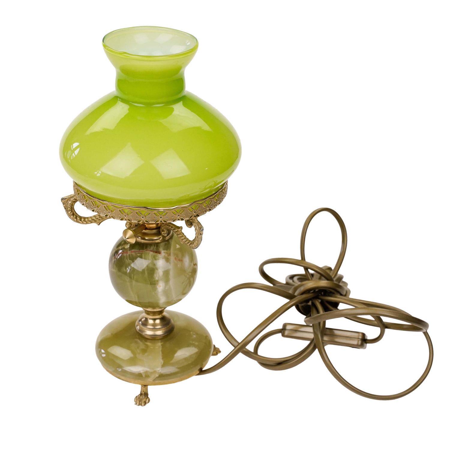 Przedmiotem sprzedaży jest lampka kształtem przypominająca lampę naftową. Niepowtarzalna stylistyka i najwyższa jakość wykonania. Misterna konstrukcja podstawy wykonana z kamienia w zielonym kolorze z widocznymi żyłkami i mosiądzu. Lampa posiada jeden punkt świetlny na żarówkę z małym gwintem. Ładna, klasyczna forma z podstawą osadzoną na trzech lwich łapach. Na podstawie klosz ze szkła dwuwarstwowego. na zewnątrz zielonego, wewnątrz białego. Elektryka: przewód, wtyczka, włącznik o oprawka, wymienione.