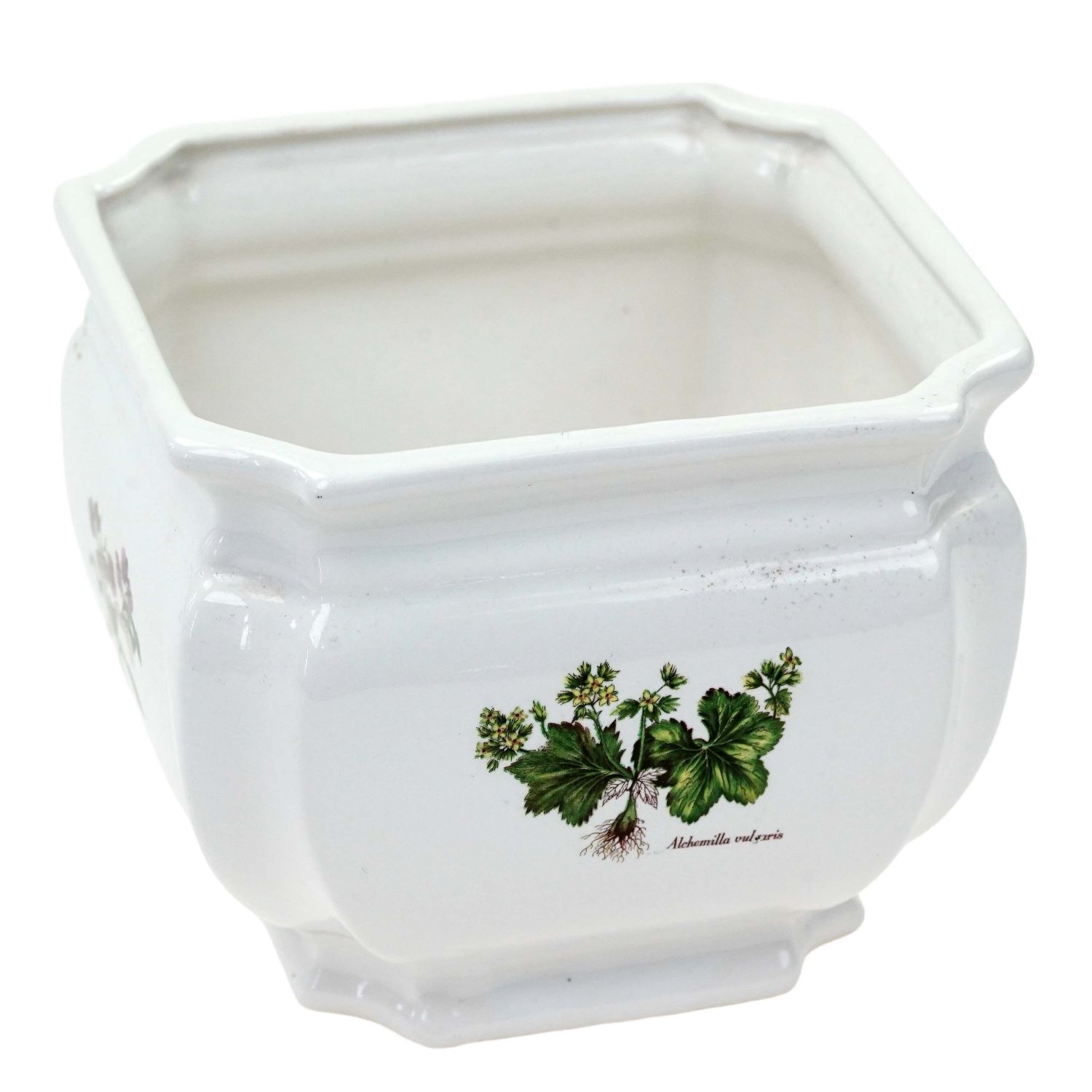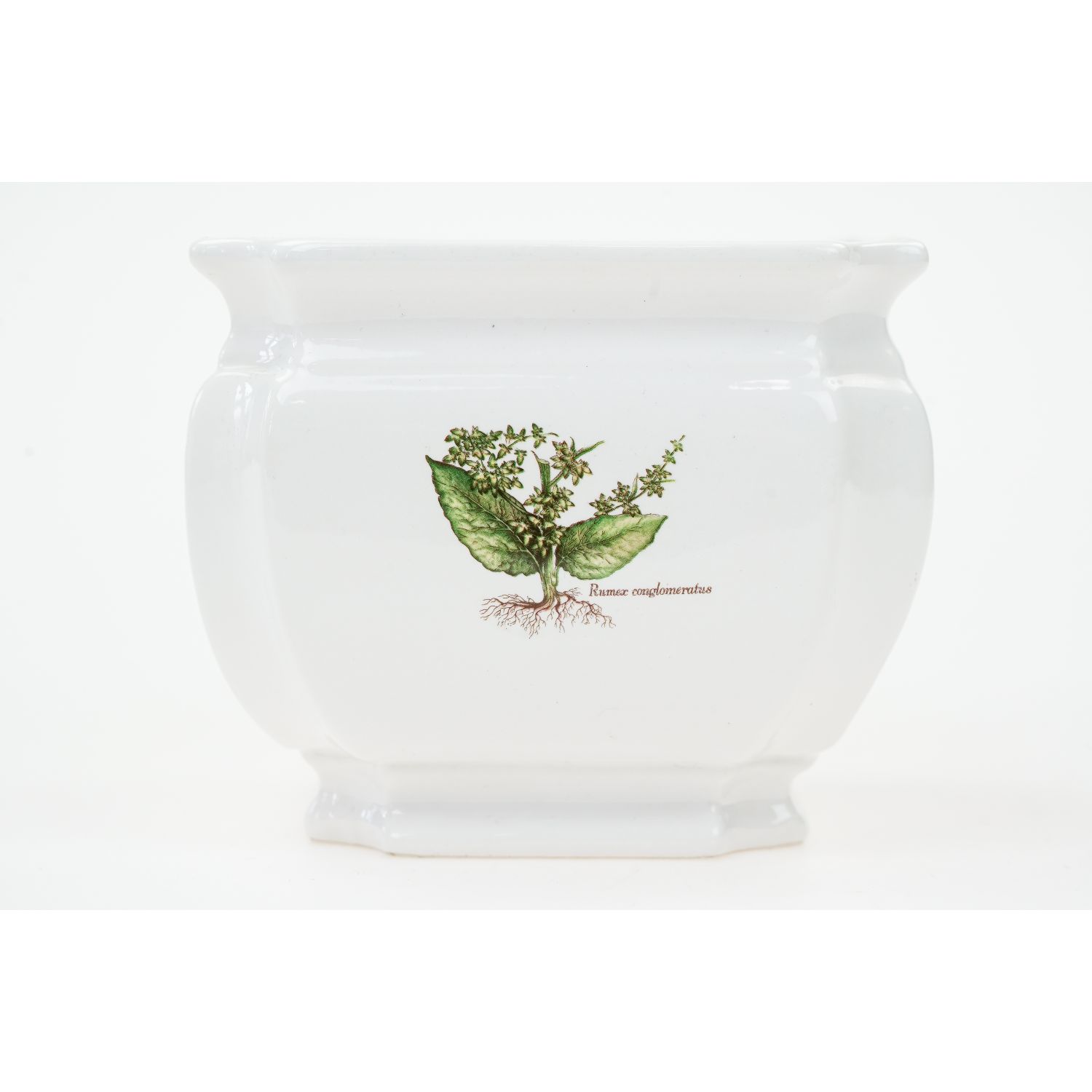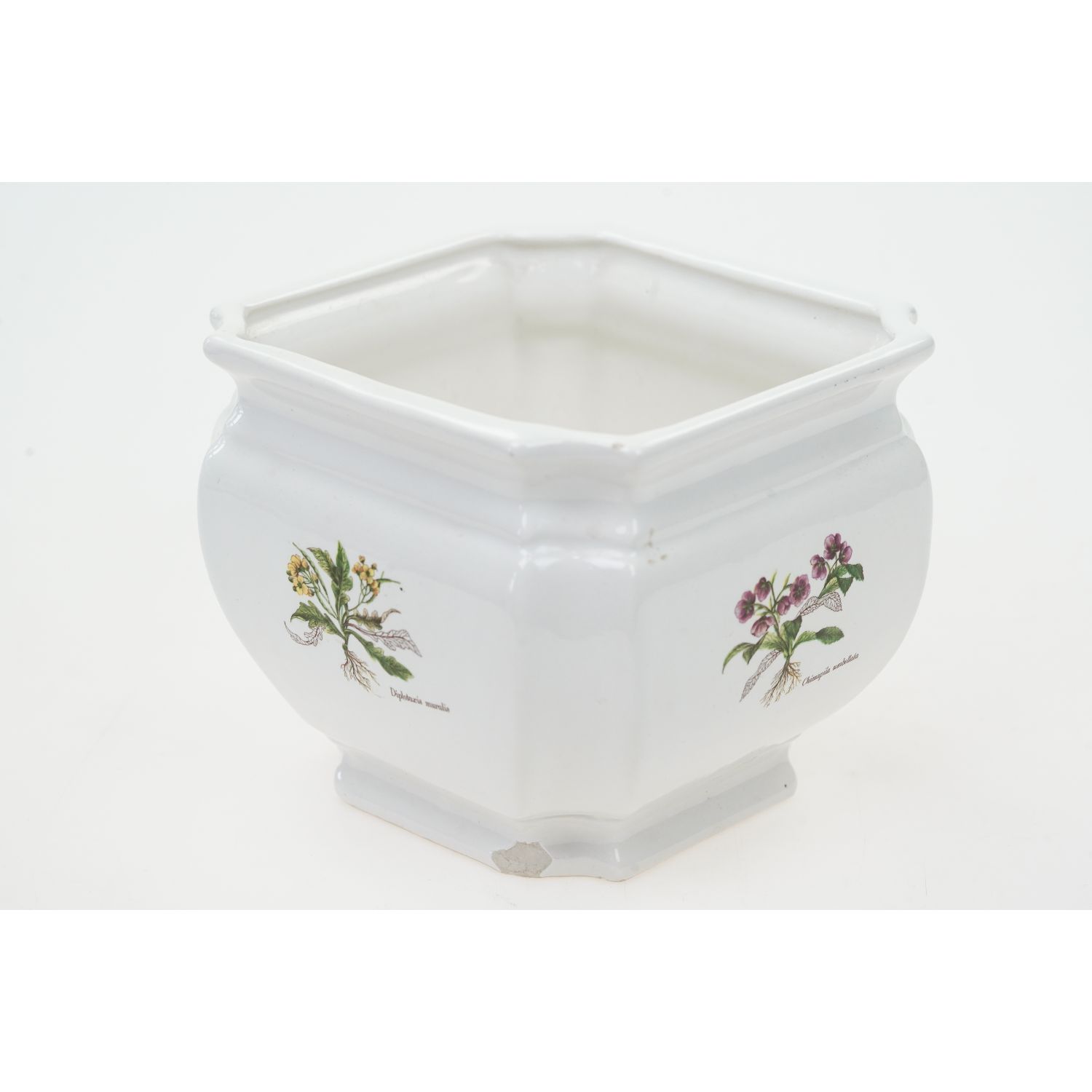 Nie posiada sygnatury. Całość w odcieniu bieli, na węższym cokoliku. Doniczka ma ośmiokątny kształt. Z czterech stron roślinne dekoracje imitujące rycinę ze starego zielnika. Każdy rysunek przedstawia inną roślinkę.
