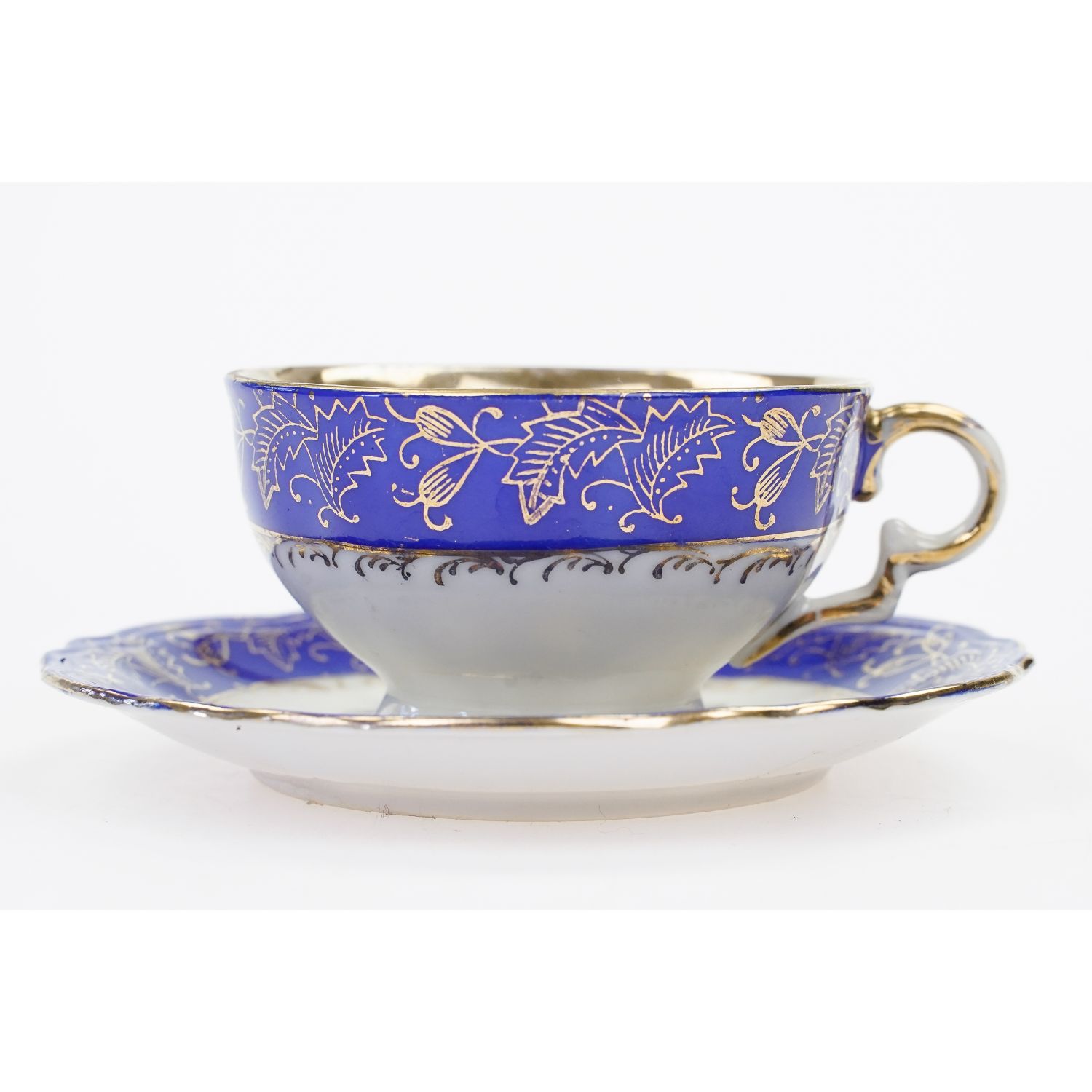 Nie jest sygnowana. Porcelana w kolorze kości słoniowej ze złoconym wnętrzem. Oba elementy udekorowane szafirowymi szlaczkami ze złotymi kwiatowymi ornamentami. W złocie górna i dolna krawędź.