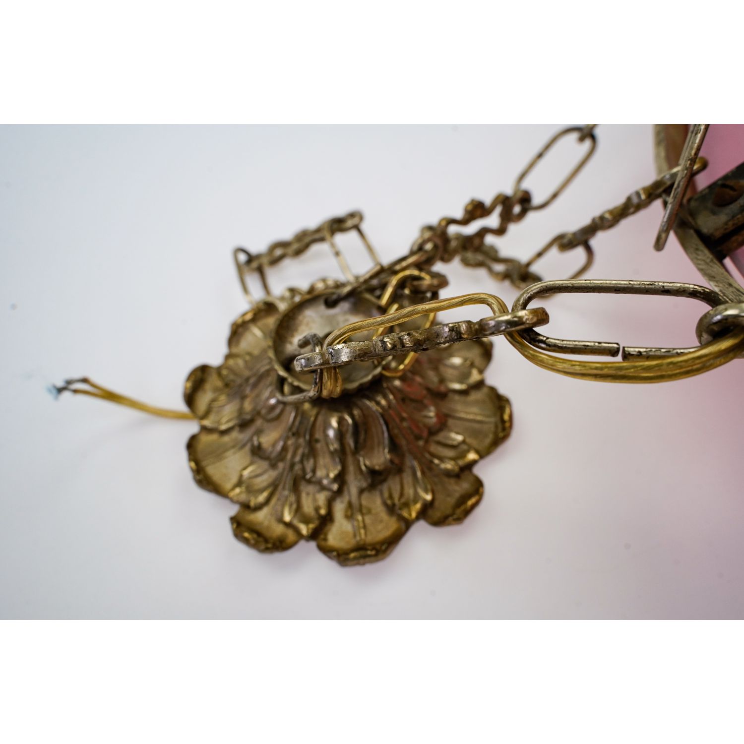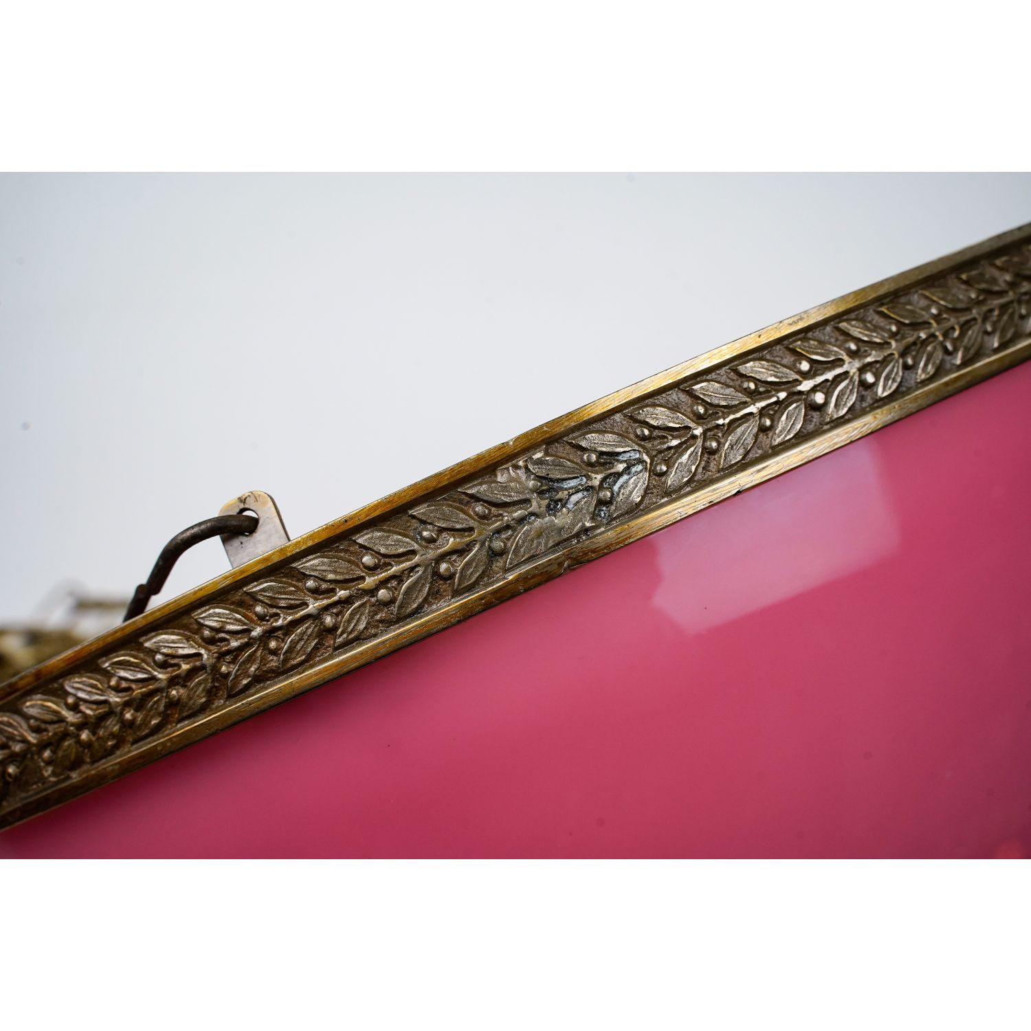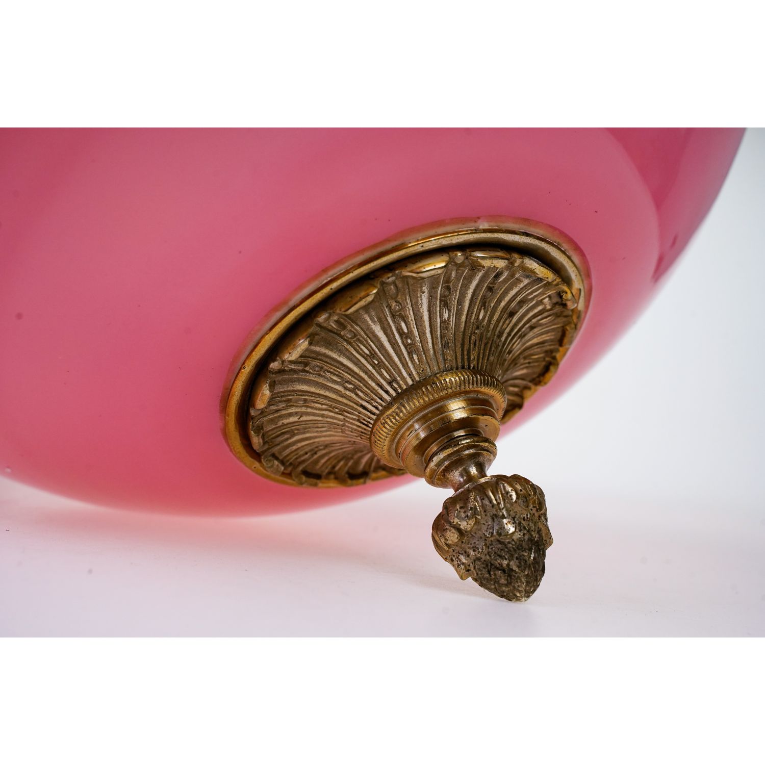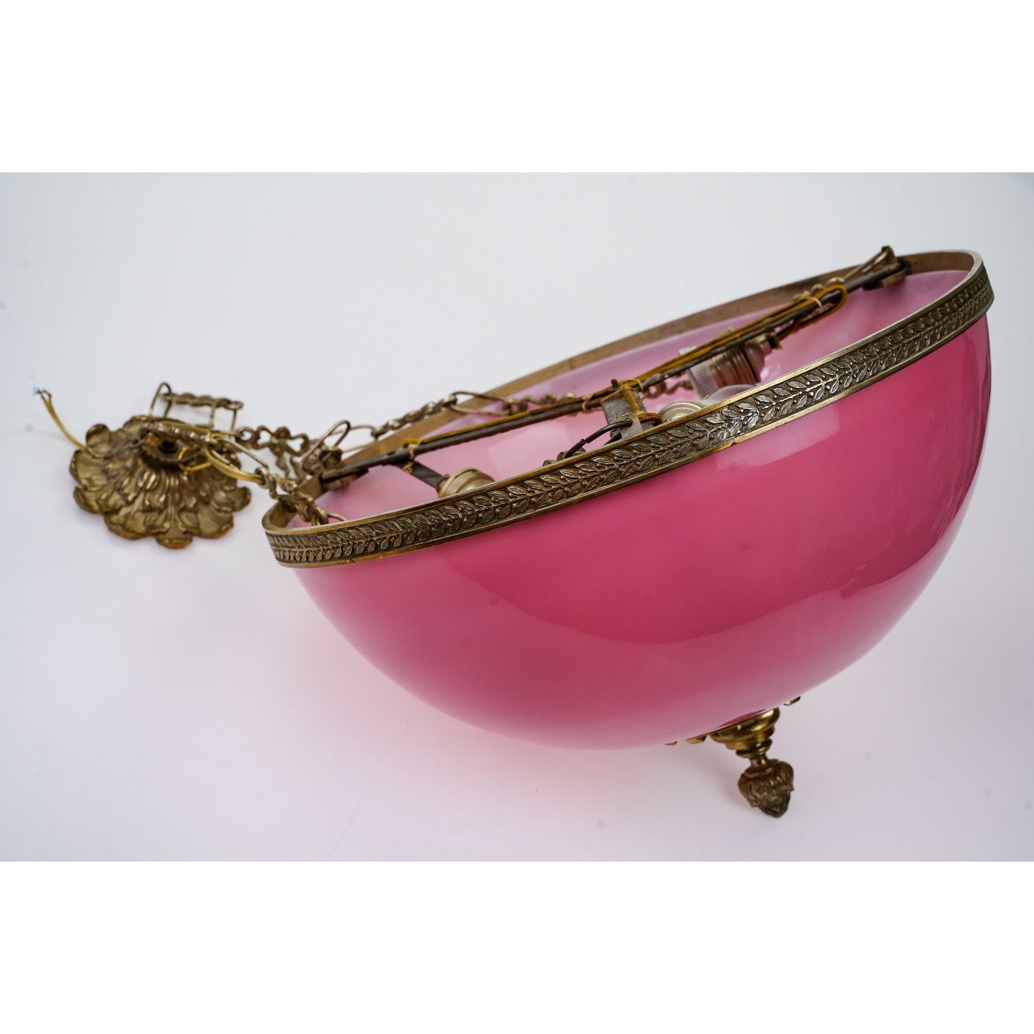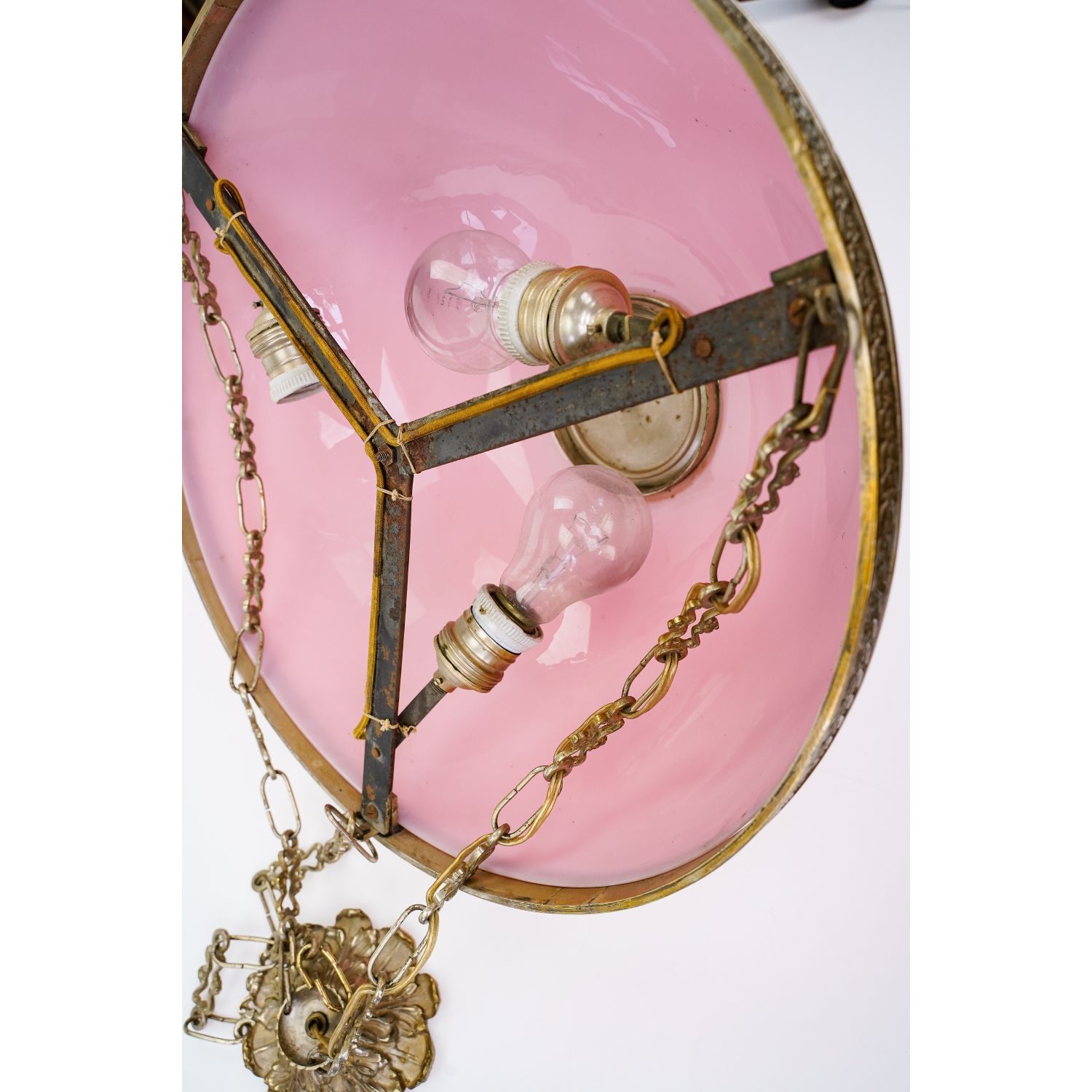 Z pięknym, gładkim różowym kloszem w kształcie półkuli. Lampa jest vintage. Szkło jest oryginalne, dwuwarstwowe; wewnątrz mlecznobiałe, na zewnątrz różowe. Wewnątrz mosiężna konstrukcja bardzo zdobna. Lampa jest solidna, masywna. Prezentowana lampa dołoży piękna i charakteru każdemu wnętrzu. Z trzema punktami świetlnymi przystosowanymi do żarówek z dużym, standardowym gwintem.